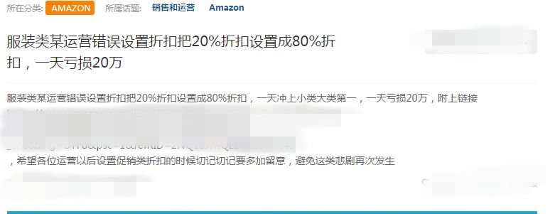 亿恩网了解到,之所以会发生这样神奇的事,原来是因为一位运营太过粗心,在进行促销折扣码设置的时候错误地把20%的折扣设置成了80%的折扣,消费者看到折扣力度这么大,就开始疯抢产品,虽然销量和排名迅速提上去了,但是这位卖家完全是在亏本做生意,光一天就亏损了20万,最后卖家以惨痛的代价告诫各位运营:在设置促销类折扣的时候切记切记要多加留意,避免这类悲剧再次发生。