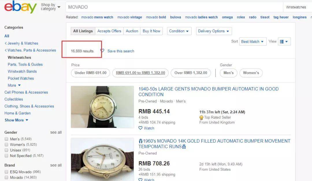 在亚马逊和ebay平台搜索手表,可以搜索到几万到几百万的相关链接结果,可见市场庞大,其中涉及MOVADO品牌的搜索结果如下: