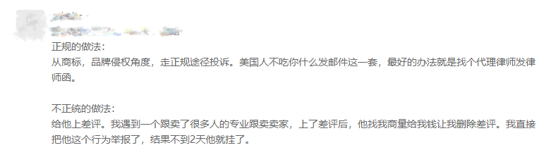 除了以上的方法,还有卖家提出了不正统的做法,就是给侵权的卖家上差评。亿恩网在这里友情提醒,“以恶制恶”的方式最好不要用,小心在举报对手侵权的同时也把自己的账号给整没了。