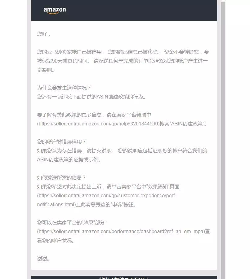 除了上述的六条以外,这一波有些朋友是被误伤了:比如有人因为加拿大站违规但是美国站被封的,还有因为换卡结果收到ASIN创建被封的邮件,还有就是拆变体被封号的等等。这些严格来说是不属于违反ASIN创建政策的,但是都因为违反ASIN创建政策被封号,我只能说这些老铁比较倒霉了,真的是无辜躺枪了。