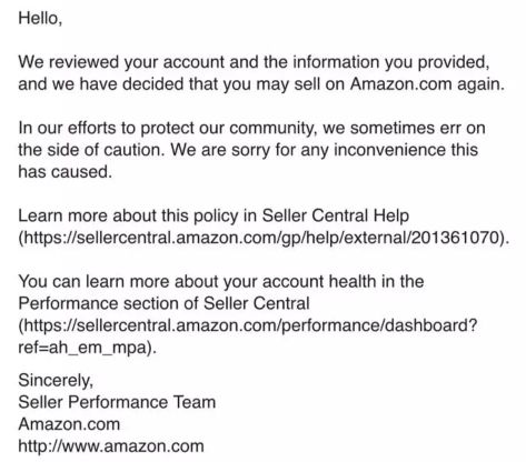 不过,好在亚马逊爸爸知错能改,最近这批误杀的账号开始海量恢复当中,很多误伤的账号都直接恢复销售权限了,而且亚马逊也承认自己是误杀的。如果觉得自己很干净,是被误杀的朋友,一定要坚持写申诉信,不要承认自己犯错了,要坚持自己是干净的,肯定是可以被放出来的,毕竟已经有先例了。