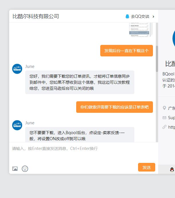 根据卖家向亿恩网提供的聊天截图,他提出质疑后,客服并没有正面回答这个问题,只是这样回答:如果卖家不想下载,可以进入Bqool后台,点设定-卖家反馈-一般,将设置ON改成off,并声称这个动作不会影响邀评电邮。