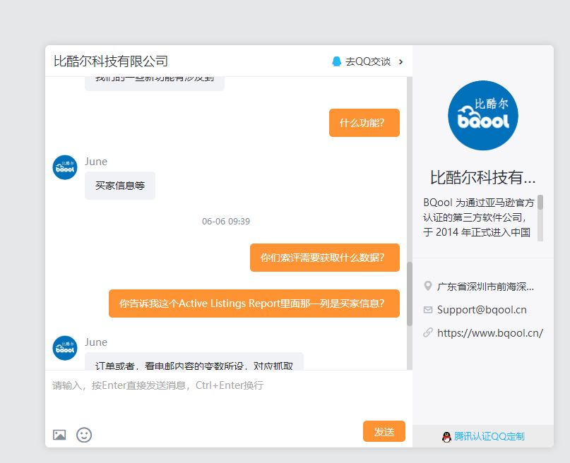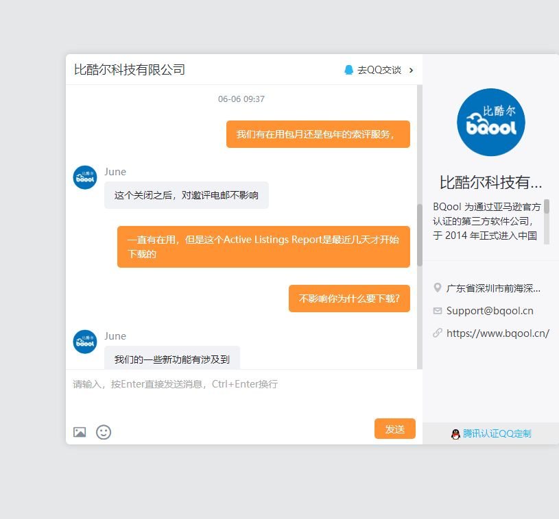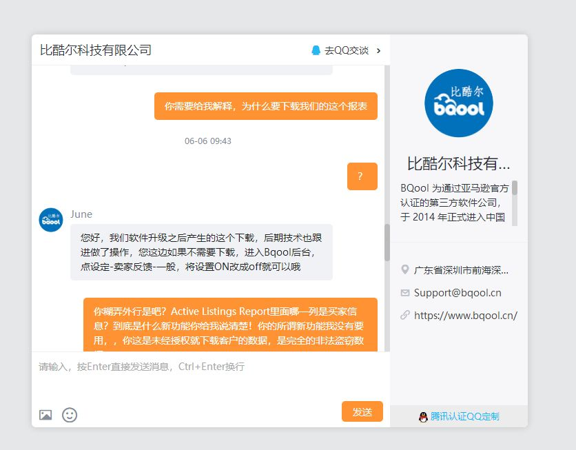 这位卖家向亿恩网表示,他们一直在用BQool的索评功能,6月6日时,突然发现后台存在私自下载Active Listings Report这个问题,卖家疑惑不已,之前并没有出现这种情况,并担心他们私自下载收集保存用户数据会用作其他用途。于是他就开始找比酷尔进行说理。