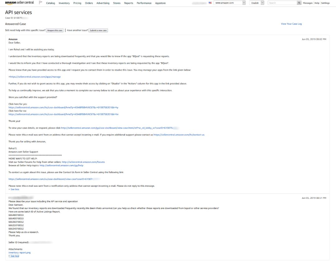 发现比酷尔存在未经允许下载Active Listings Report的情况后,这位卖家除了向比酷尔客服进行求证,还向亚马逊客服寻求了帮助。从亚马逊回复的邮件内容可以看出,卖家的这些库存报告请求确实是由BQool应用发出的,不过卖家已同意让该应用获取这些报告。