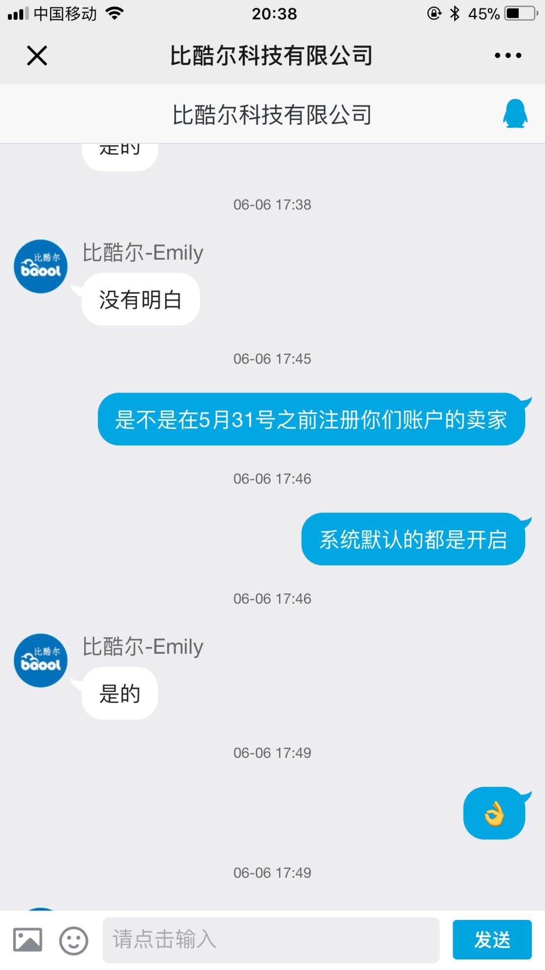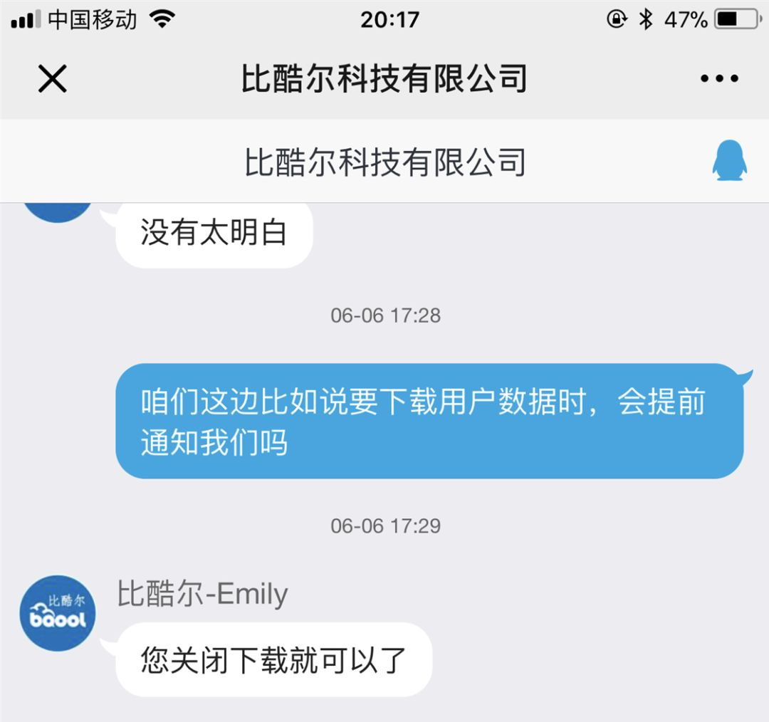 客服同时表示,因为这个下载是软件正常运行需要,但是因为有很多卖家存在一些担心,根据卖家提的意见,比酷尔设置了开启、关闭按钮,自北京时间5月31日上午8点起注册的用户,下载用户数据这项是处于默认关闭的状态,如果有卖家有需要可以要求开启。