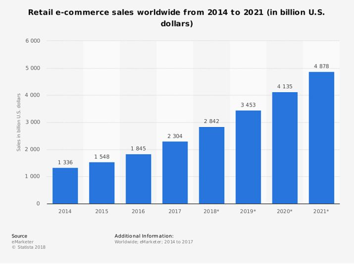 如今,我们已经看到Uber颠覆了出租车行业,亚马逊通过收购全食超市在食品杂货领域掀起了波澜等事件,预计电子商务将在未来“扰乱”更多行业的发展。如下图Statista(数据分析公司)的数据图表所示,2019年全球零售电商销售总额预计将达到3.453万亿美元,到2021年将达到4.878万亿美元。