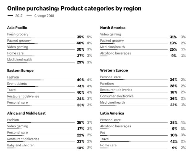 如下图所示,2018年34%的北美消费者在网购时会购买视频游戏;东欧及非洲和中东地区的消费者都更偏好购买时尚品,比例分别为53%和38%;38%的西欧消费者则会购买消费电子产品。