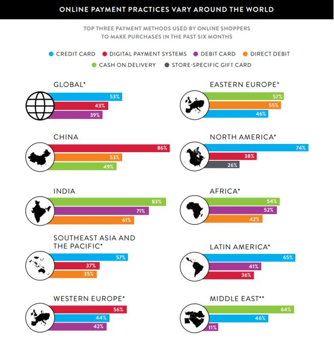 (图:不同国家和地区消费者对支付方式的偏好,绿色/信用卡,红色/数字支付系统,紫色/借记卡,橙色/直接借记,绿色/货到付款,黑色/商店礼品卡)