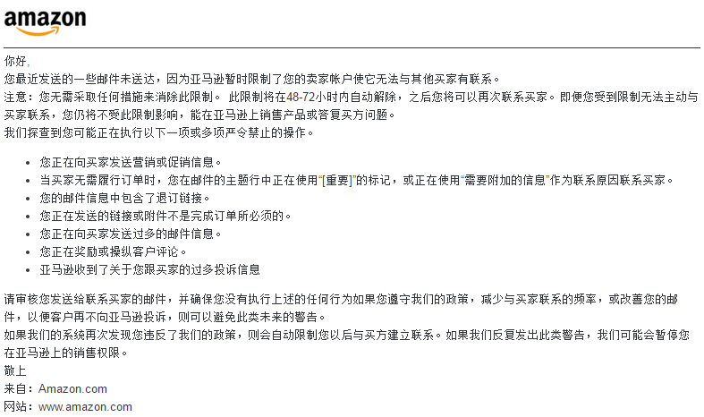 卖家分别于4月中旬与5月下旬收到了来自亚马逊的警告信,被限制主动与买家进行联系,每次都会限制72小时。卖家也是一脸懵,不知道哪里触犯了亚马逊的规则。