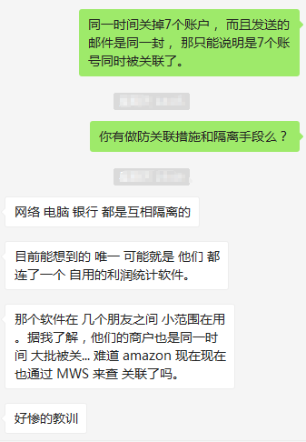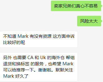 这些问题都留给专业的亚马逊卖家兄弟姐妹们吧?你们才是真正的专家,这涉及到你们的真金白银,所以,你们自己的判断应该是最准确的。因为一旦账号出了问题,就要像这位损失了7个账号的卖家兄弟一样,如果有FBA库存,就要找退货的海外仓服务公司,帮他来退货接收并进行换标签。这样下来就要损失很多很多钱!想到这里,Mark都能想象到卖家心里其实是在滴血的,而Mark唯一能做的就是默默地帮这个卖家兄弟去找他需要的资源……