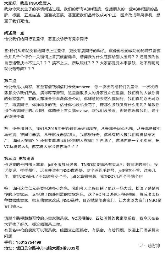 Mark一向敬重做事坦坦荡荡之人,TNSO乙方能够坦诚地公布手机号码和公司地址,从一方面来说,也是坦荡之人。Mark最近也真的是在调停一些大卖家之间的账户运营产生的误会,其实,大家都只是互相怀疑,没有实际的证据,如果不及时调停,矛盾就会越来越深,我想其实亚马逊官方是可以找到这些问题的所在,谁干了什么不该干之事,都会留下蛛丝马迹,真正的裁判其实一直都没有出场…… (本文完)
