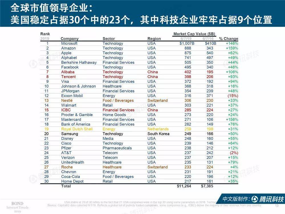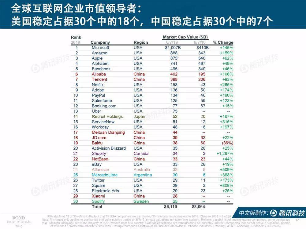 报告公布了截止6月7日,全球市值前30大互联网公司榜单,其中美国18家,中国7家,日本1家,加拿大1家,澳大利亚1家,阿根廷1家,瑞典1家。