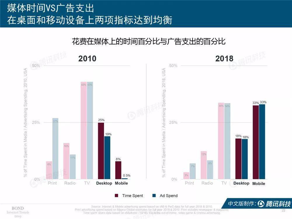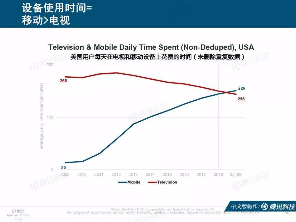 报告以美国为例,2019年,美国人每天在移动端的时间达到了226分钟,首次超过了电视端。