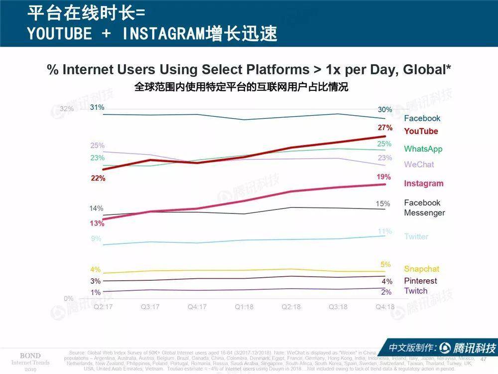 报告公布了移动端用户占比最高的几大应用:Facebook、YouTube、WhatsApp、微信、Instagram、Facebook Messenger、Twitter、Snapchat、Pinterest、Twitch。