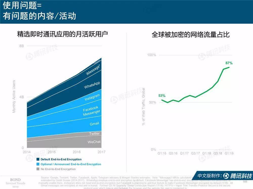 隐私是互联网领域绕不开的敏感话题。报告强调,相对于一年前来说,全球人变得更加担心互联网隐私。数据显示,在第一季度中,全球87%的网络流量是加密的,而3年前这一比例仅为53%。