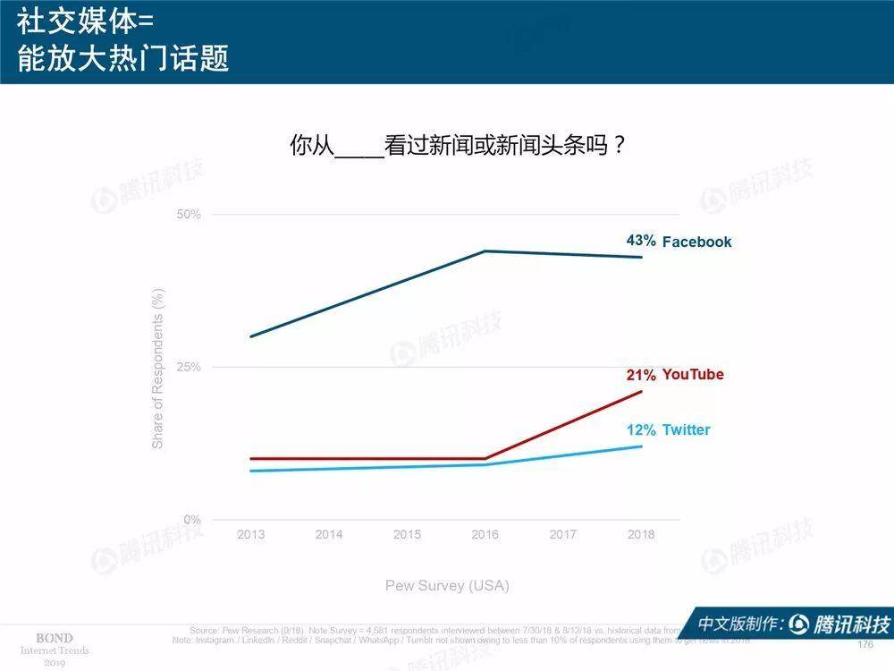 报告表示,如今有43%的人通过Facebook来获取新闻,21%的人通过YouTube,12%的人通过Twitter。所以互联网女皇认为,社交媒体可以放大热门话题。