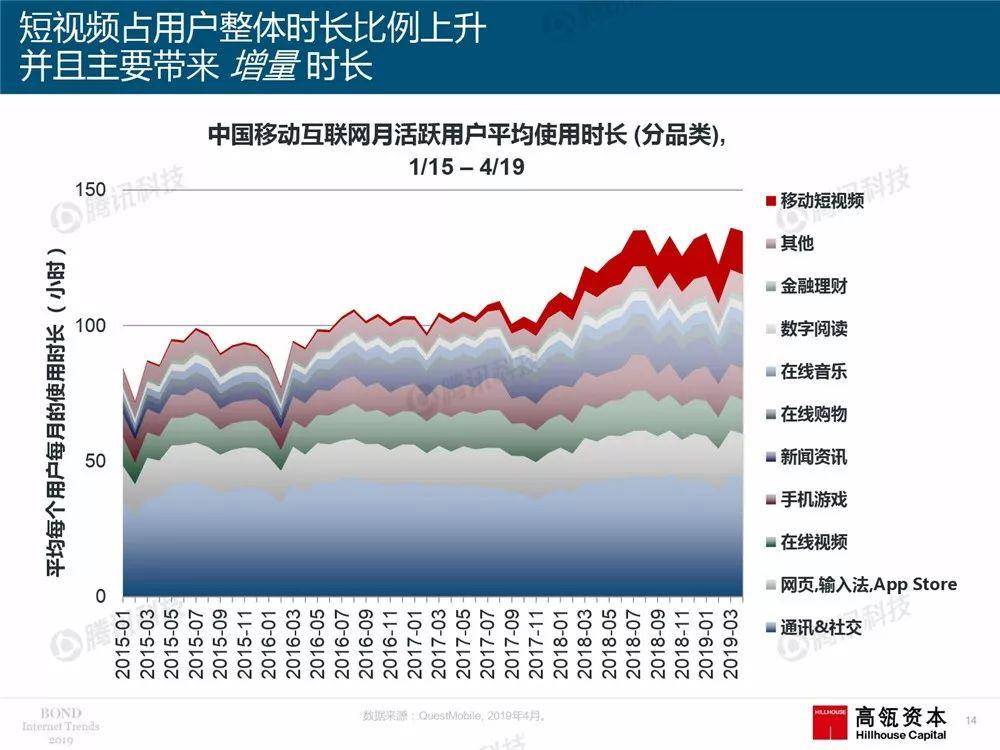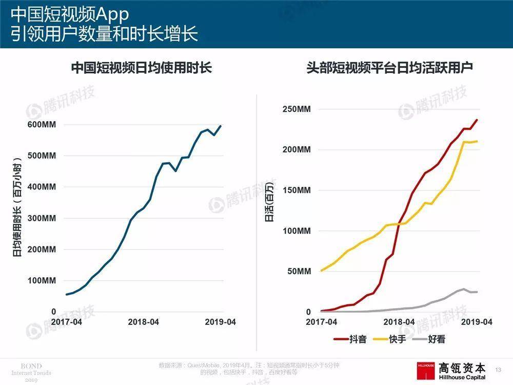 跟往年一样,报告专门用了一个章节,解读中国互联网的发展趋势。报告显示,从2017年4月,到2019年4月,中国短视频APP日均使用时长从不到1亿小时,增长到了6亿小时。