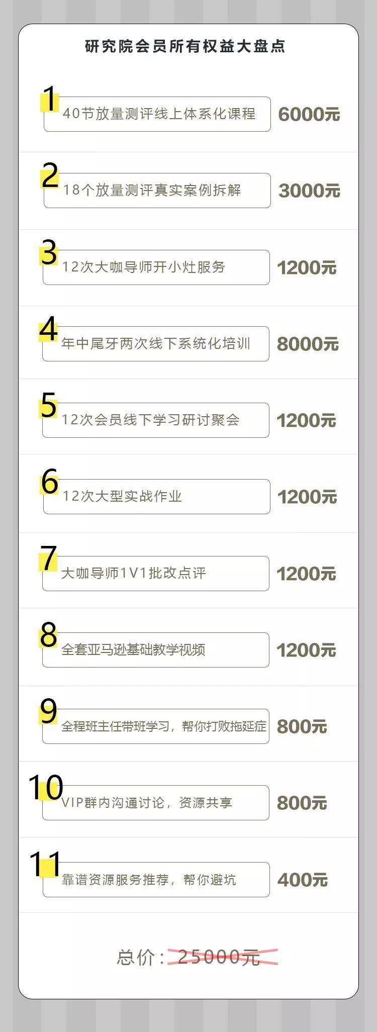 看到25000的价格,很多卖家朋友可能会被吓到。放心,在这里,我们罗列的是研究院会员的价值,而不是价格。