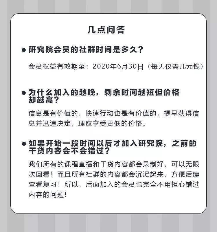 当然,收会员费还有一个重要的目的,是为了做一个筛选和过滤。我们要保证进研究院的每个成员,都是抱着学习成长的目的而来,这样才是对大家真正的负责。