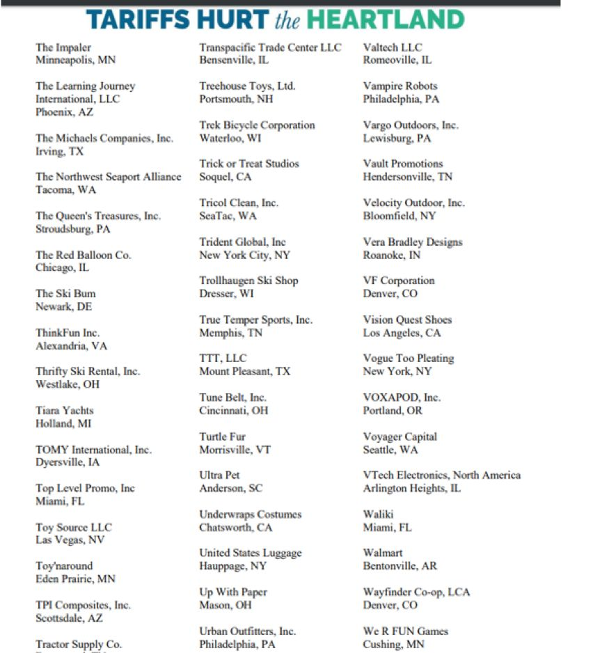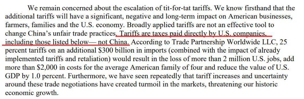 “我们对这种针锋相对的关税升级战感到担忧,”信中写道,“全面加征关税并不能有效地改善和中国的贸易。这些多出来的关税是美国企业在支付……而不是中国。”