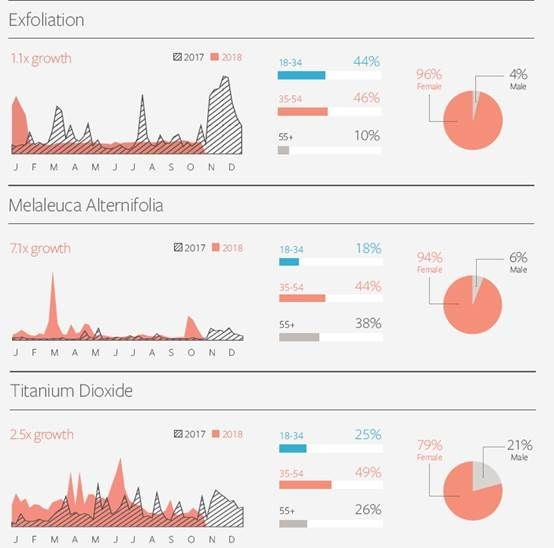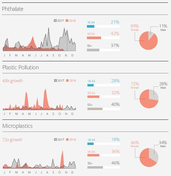 数据显示,近一半(48%)使用皮肤护理产品的美国女性都在寻求天然或有机成分的产品。随着消费者更多地关注产品及包装配方,像邻苯二甲酸盐(Phthalate,一种使塑料更有弹性的潜在有害化学物质)这样的物质在2018年网络热度急剧上升。