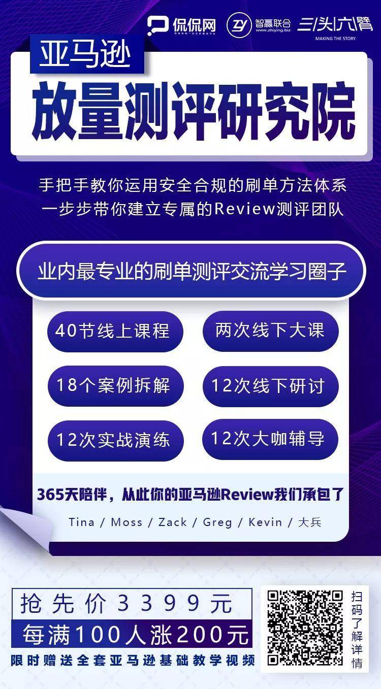 最后再次提醒一下各位老铁,亚马逊放量测评研究院正在火热报名中!行业内20+专业机构共同发起,大咖导师们365天的陪伴。手把手教你运用安全合规的刷单方法体系,一步步带你建立专属的Review测评团队!目前还属于低价状态,马上满一百人以后还会继续涨价!感兴趣的老铁可以扫码进去先了解一下,反正看一下又不怀孕!