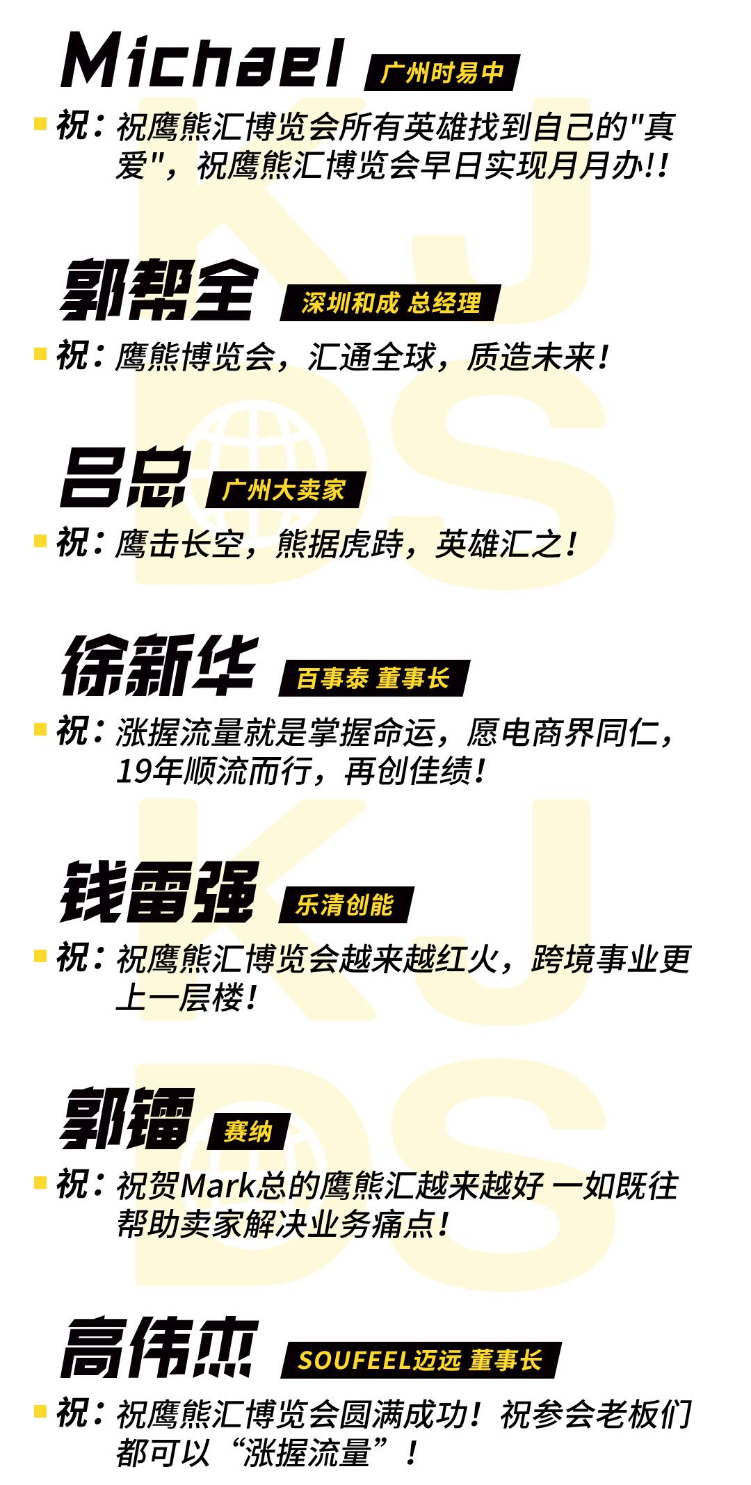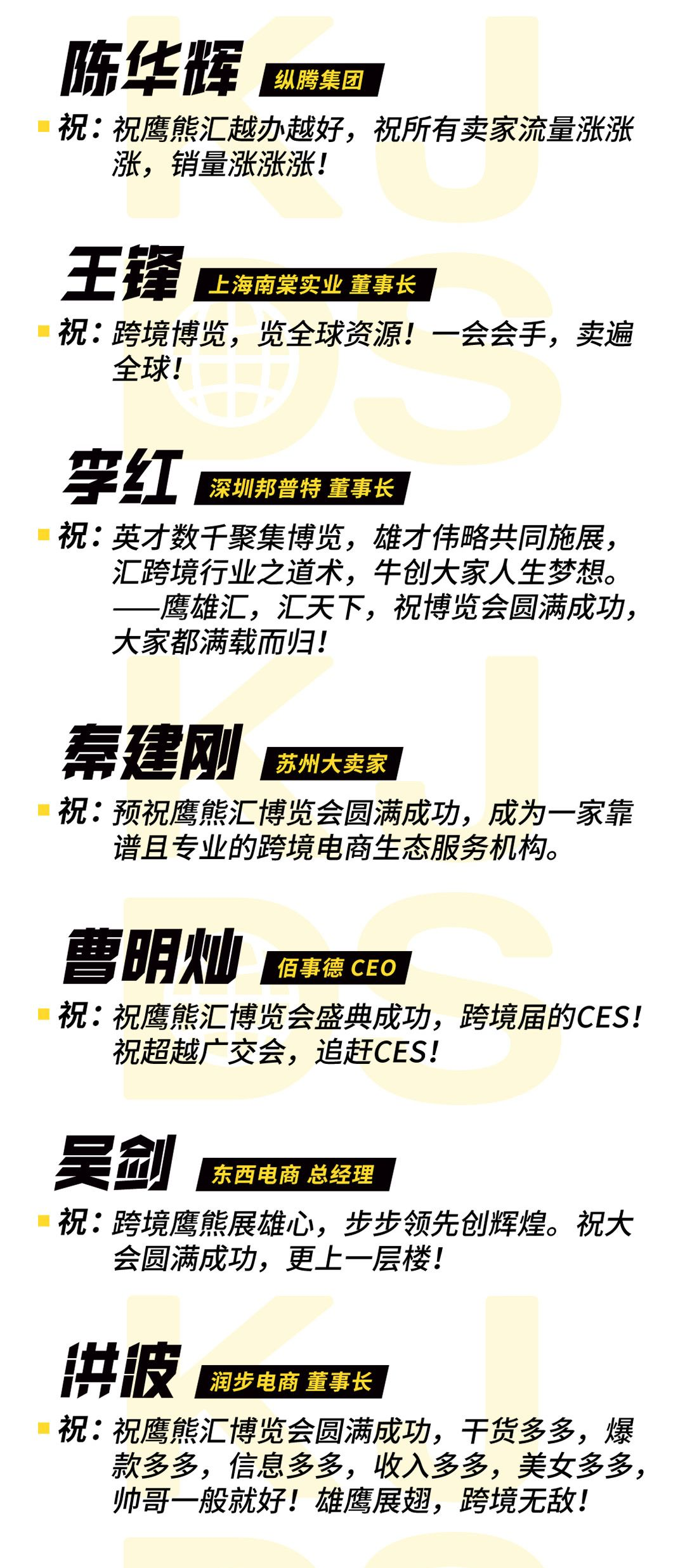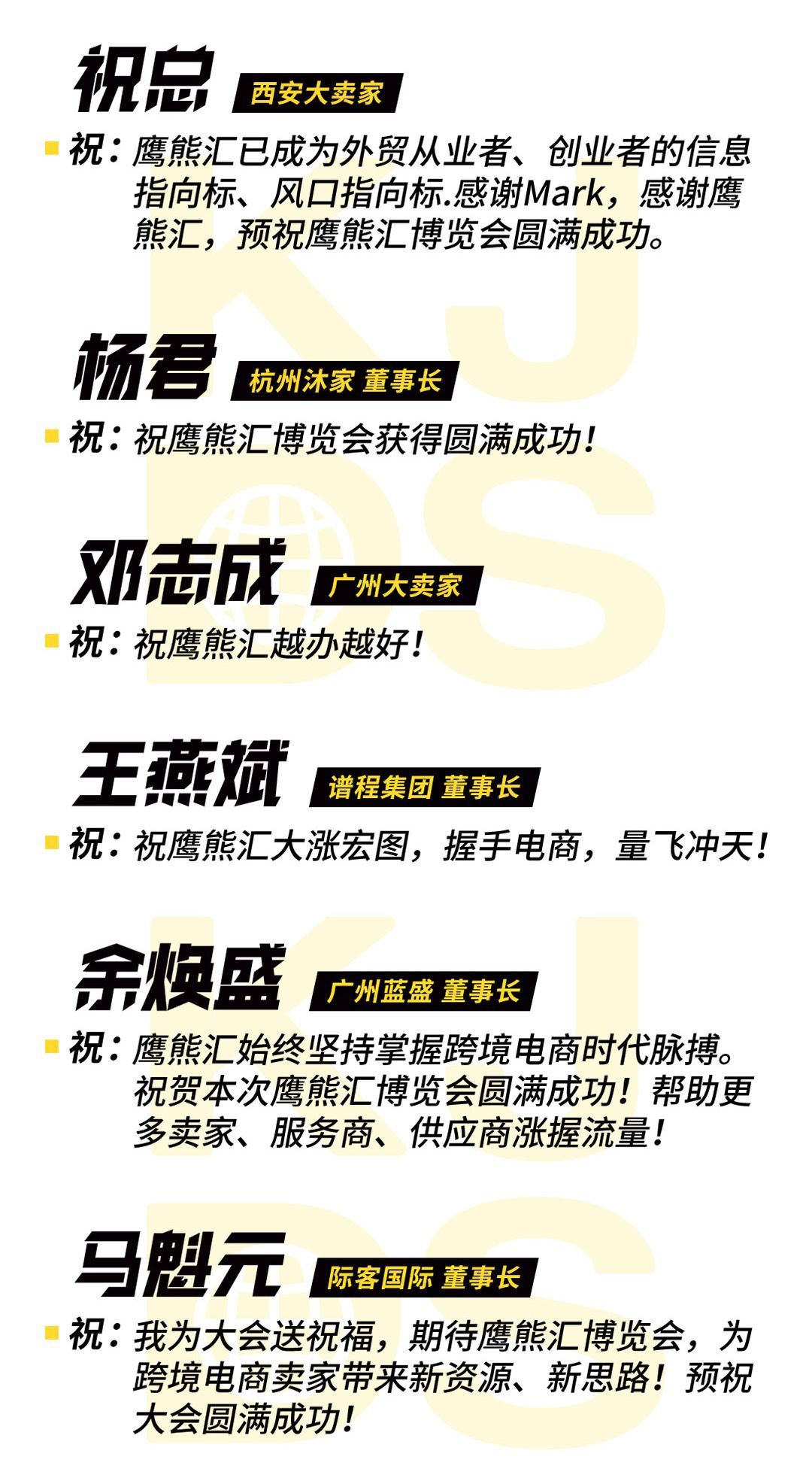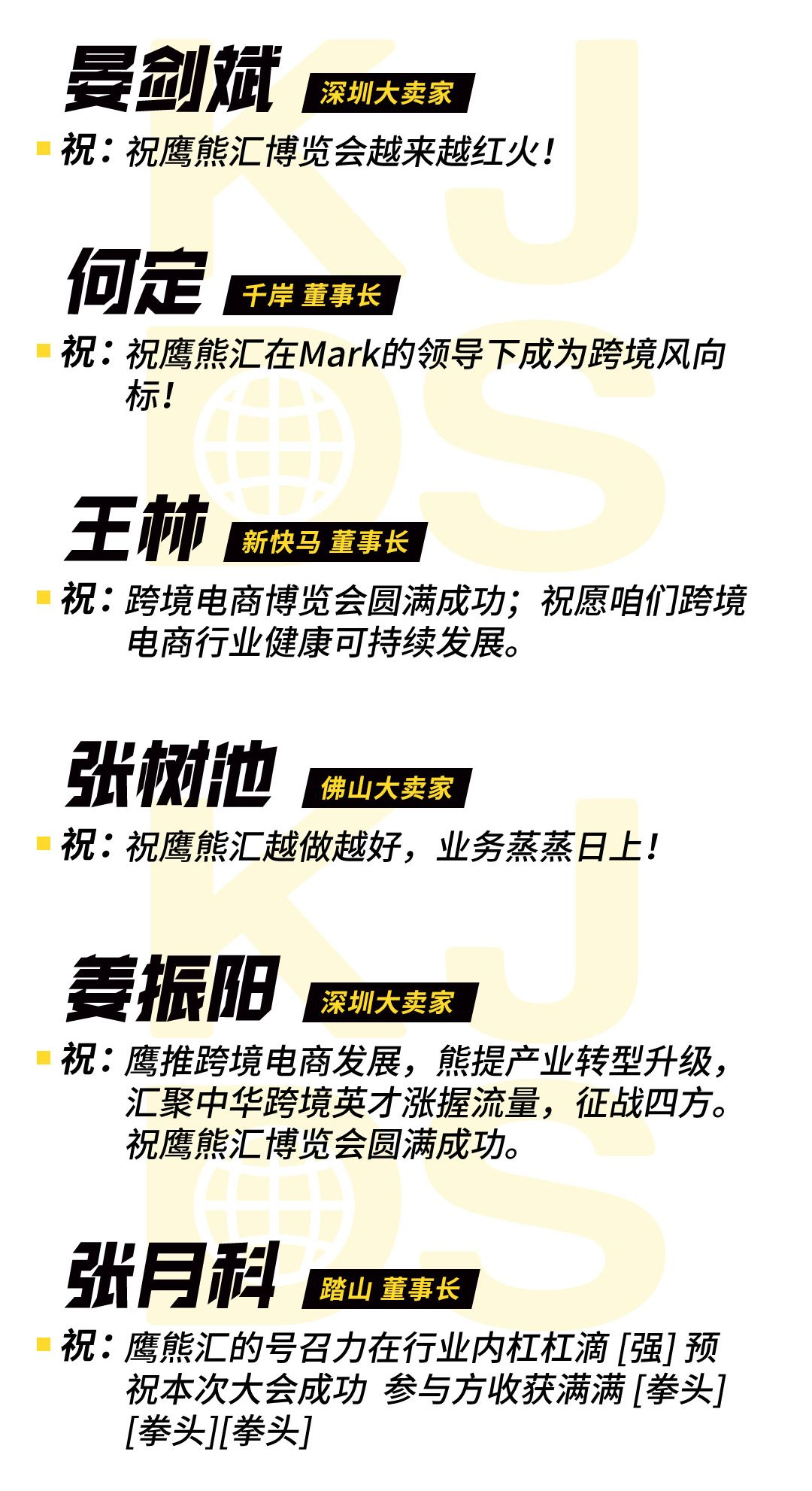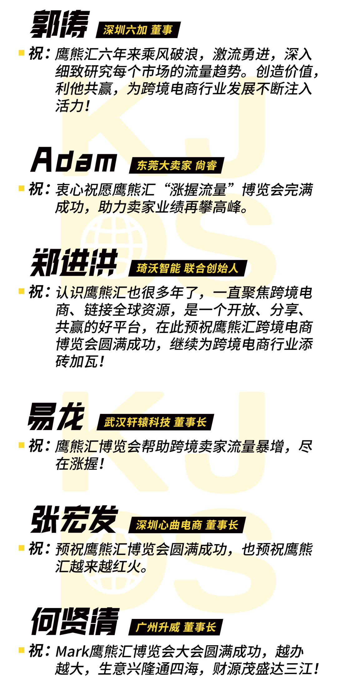 鹰熊汇将于6月29日-30日在深圳会展中心5楼举办“涨握流量”跨境电商博览会,本次博览会收到了跨境电商行业诸位行业电商公司的老板以及高管还有行业链条里的众多服务商的热烈的祝贺和诚挚的祝福!本文将列出部分行业大咖的祝福。光这份名单都已经沉甸甸了,怎么算大家整体的体量都破千亿了……