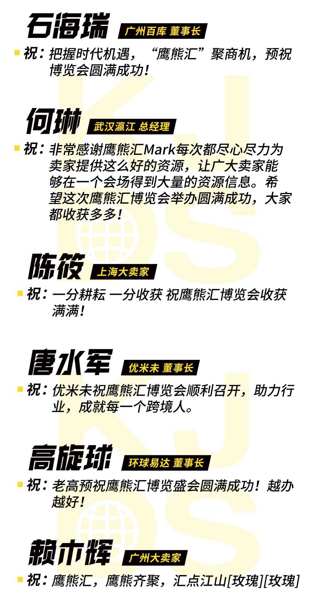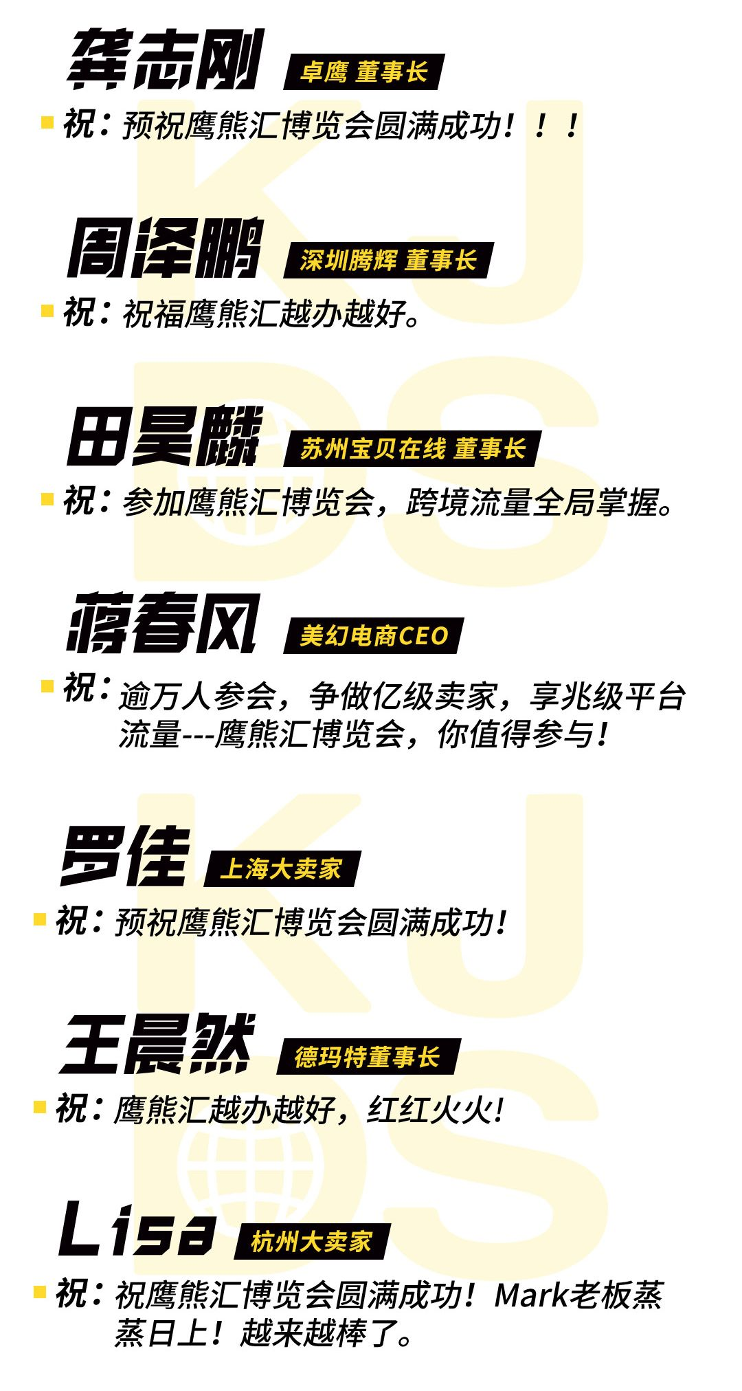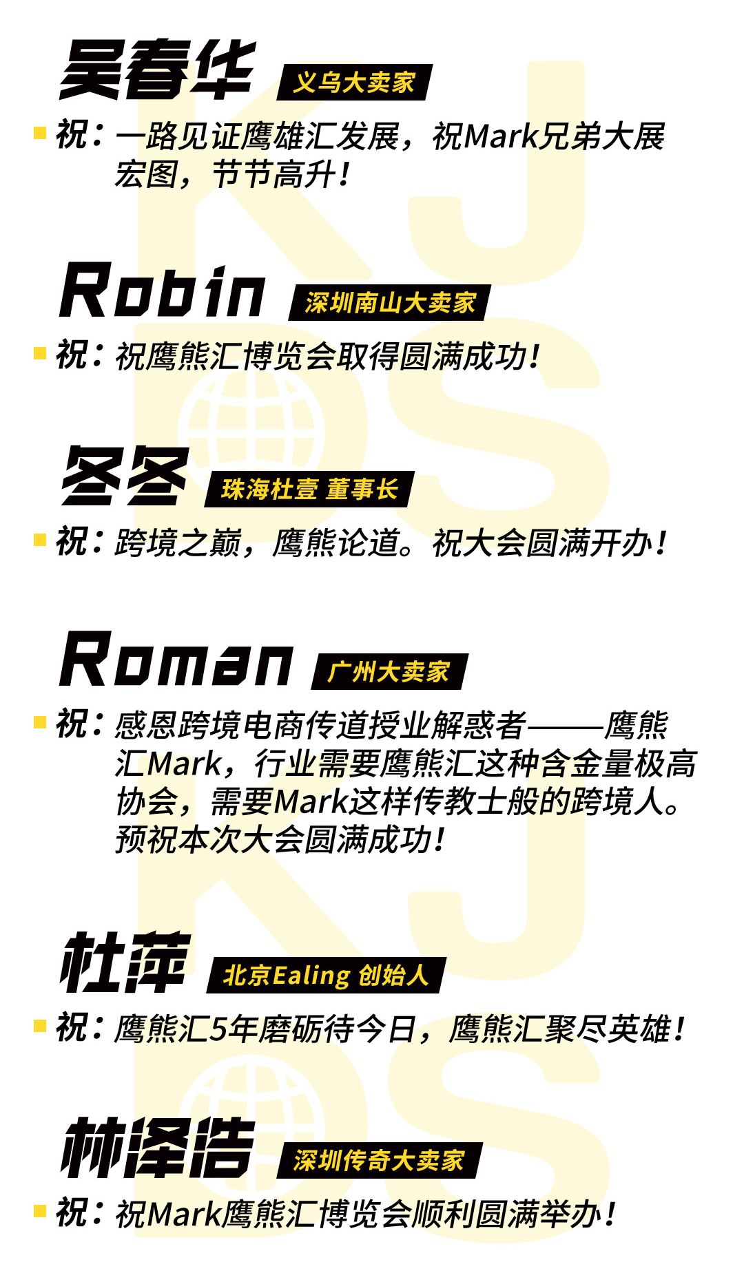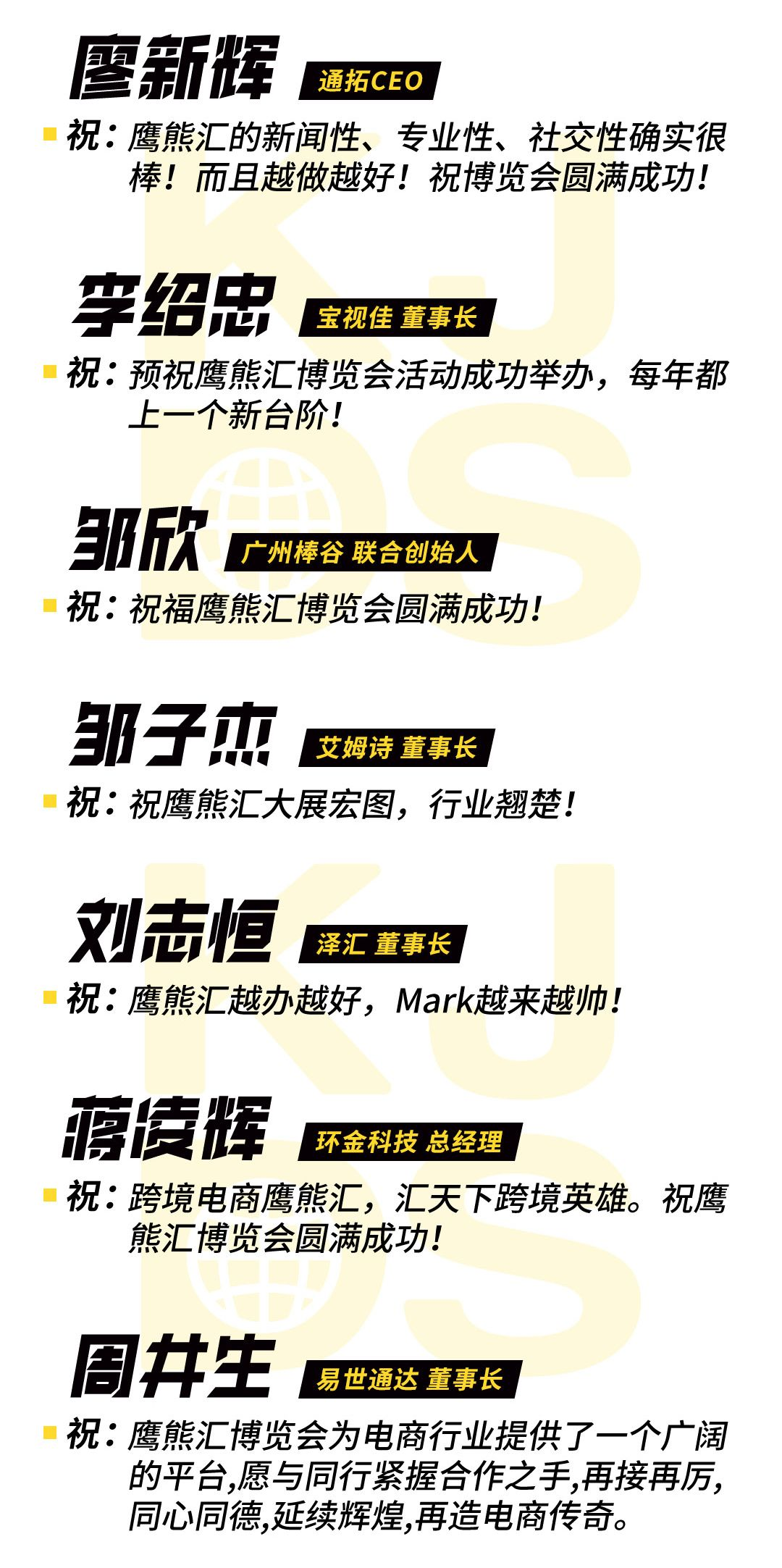 鹰熊汇将于6月29日-30日在深圳会展中心5楼举办“涨握流量”跨境电商博览会,本次博览会收到了跨境电商行业诸位行业电商公司的老板以及高管还有行业链条里的众多服务商的热烈的祝贺和诚挚的祝福!本文将列出部分行业大咖的祝福。光这份名单都已经沉甸甸了,怎么算大家整体的体量都破千亿了……