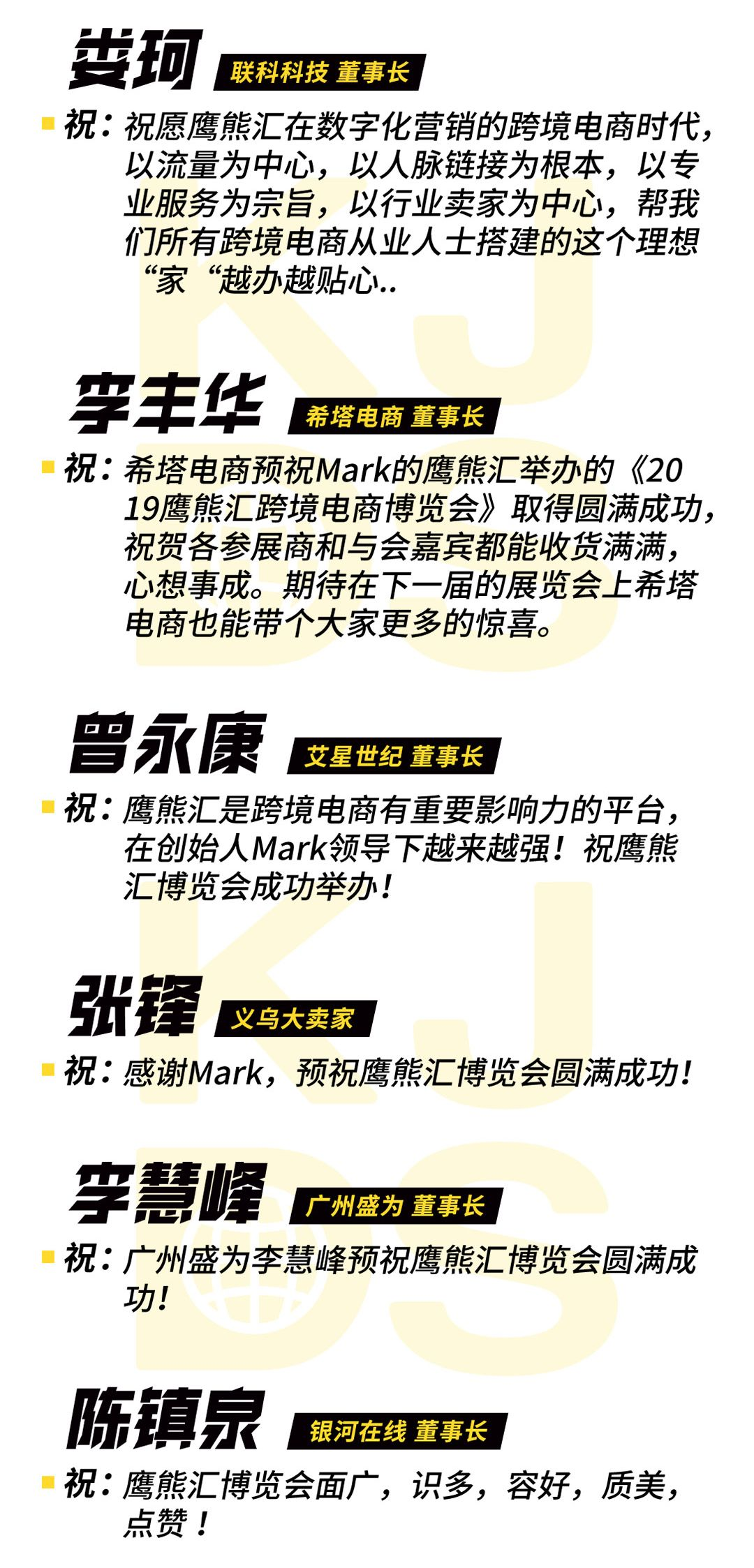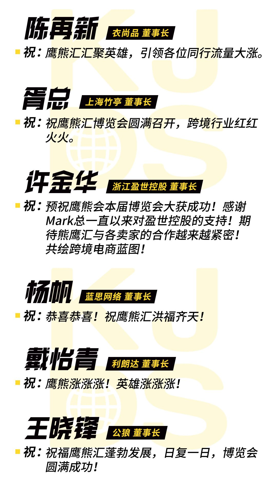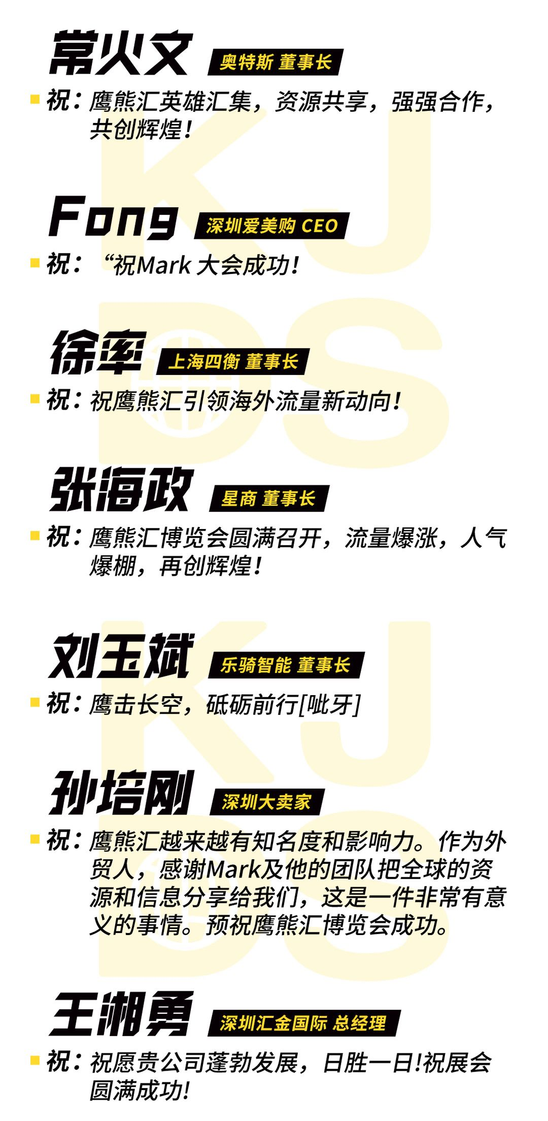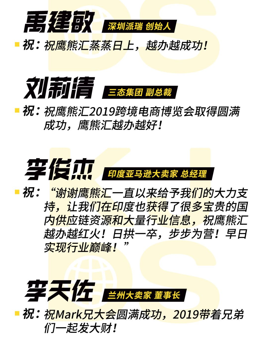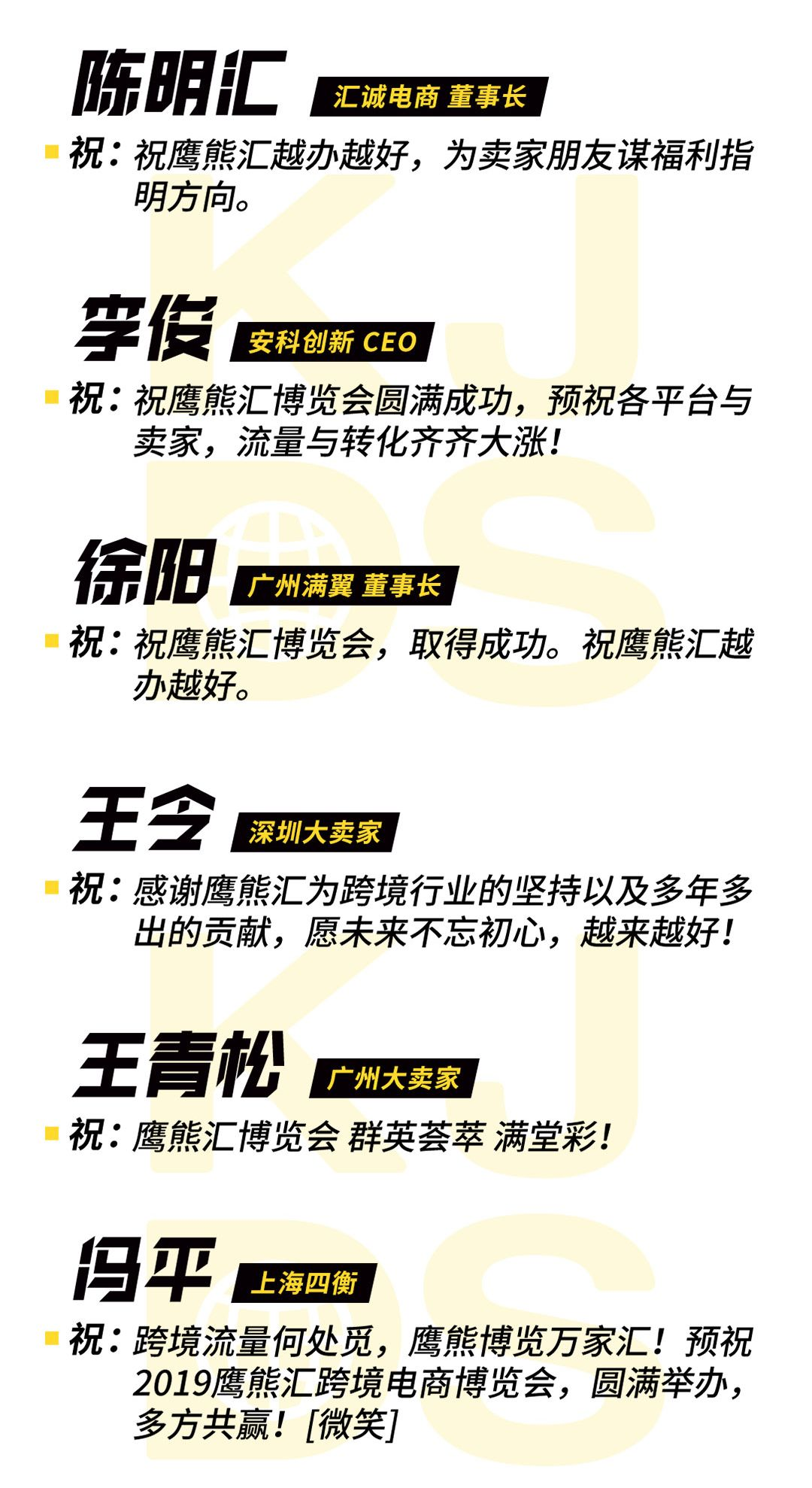 鹰熊汇将于6月29日-30日在深圳会展中心5楼举办“涨握流量”跨境电商博览会,本次博览会收到了跨境电商行业诸位行业电商公司的老板以及高管还有行业链条里的众多服务商的热烈的祝贺和诚挚的祝福!本文将列出部分行业大咖的祝福。光这份名单都已经沉甸甸了,怎么算大家整体的体量都破千亿了……