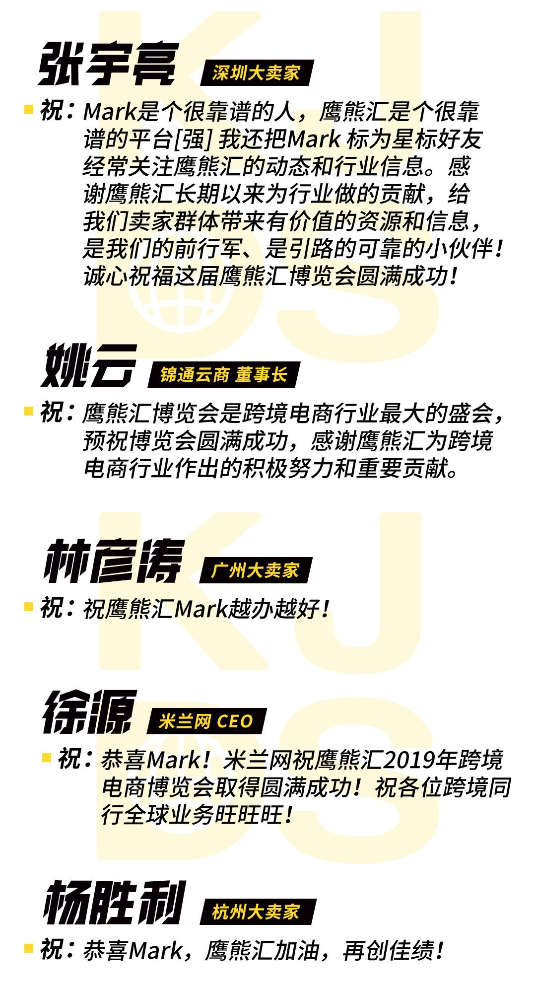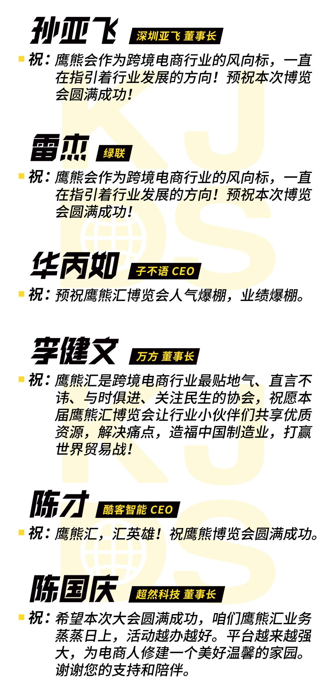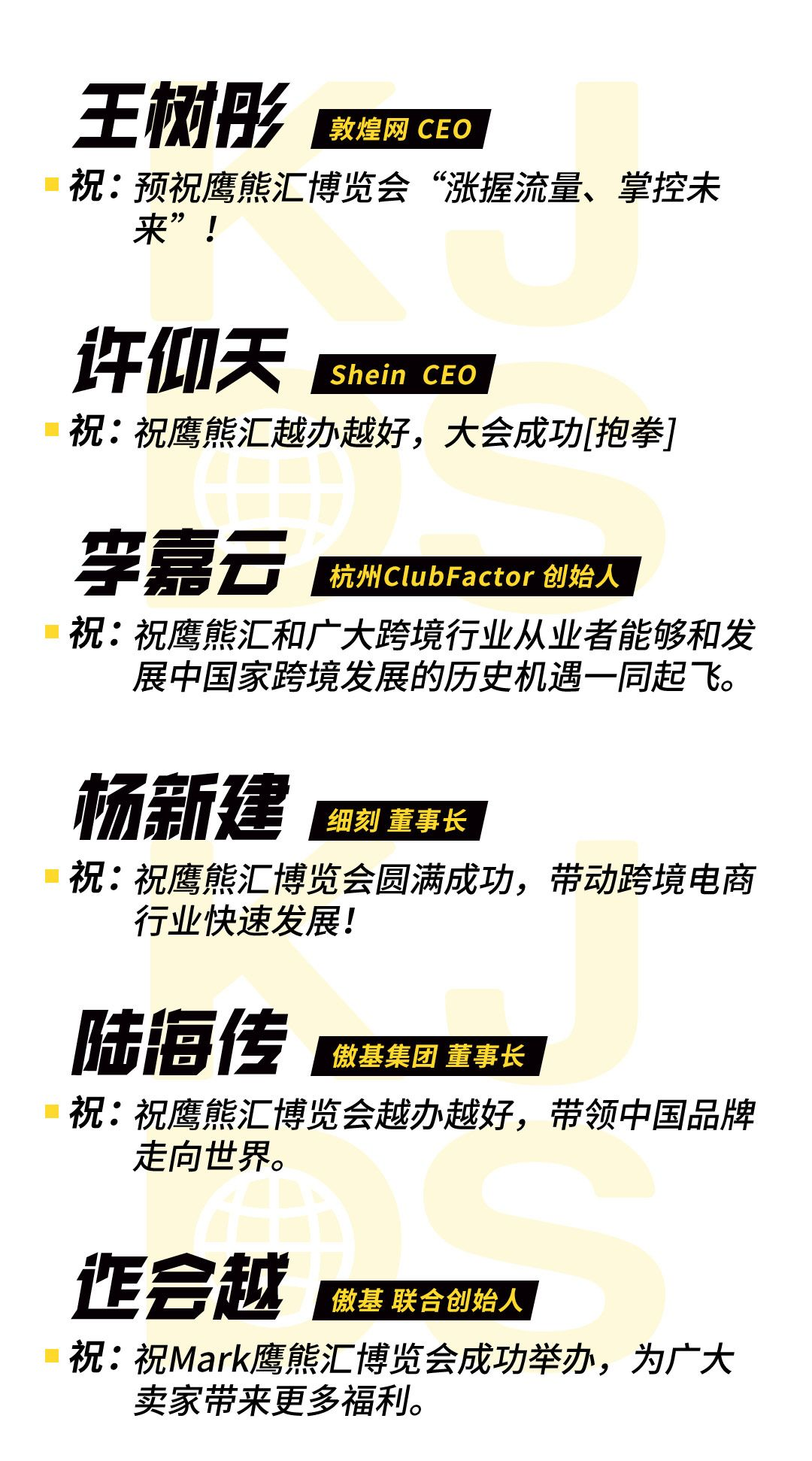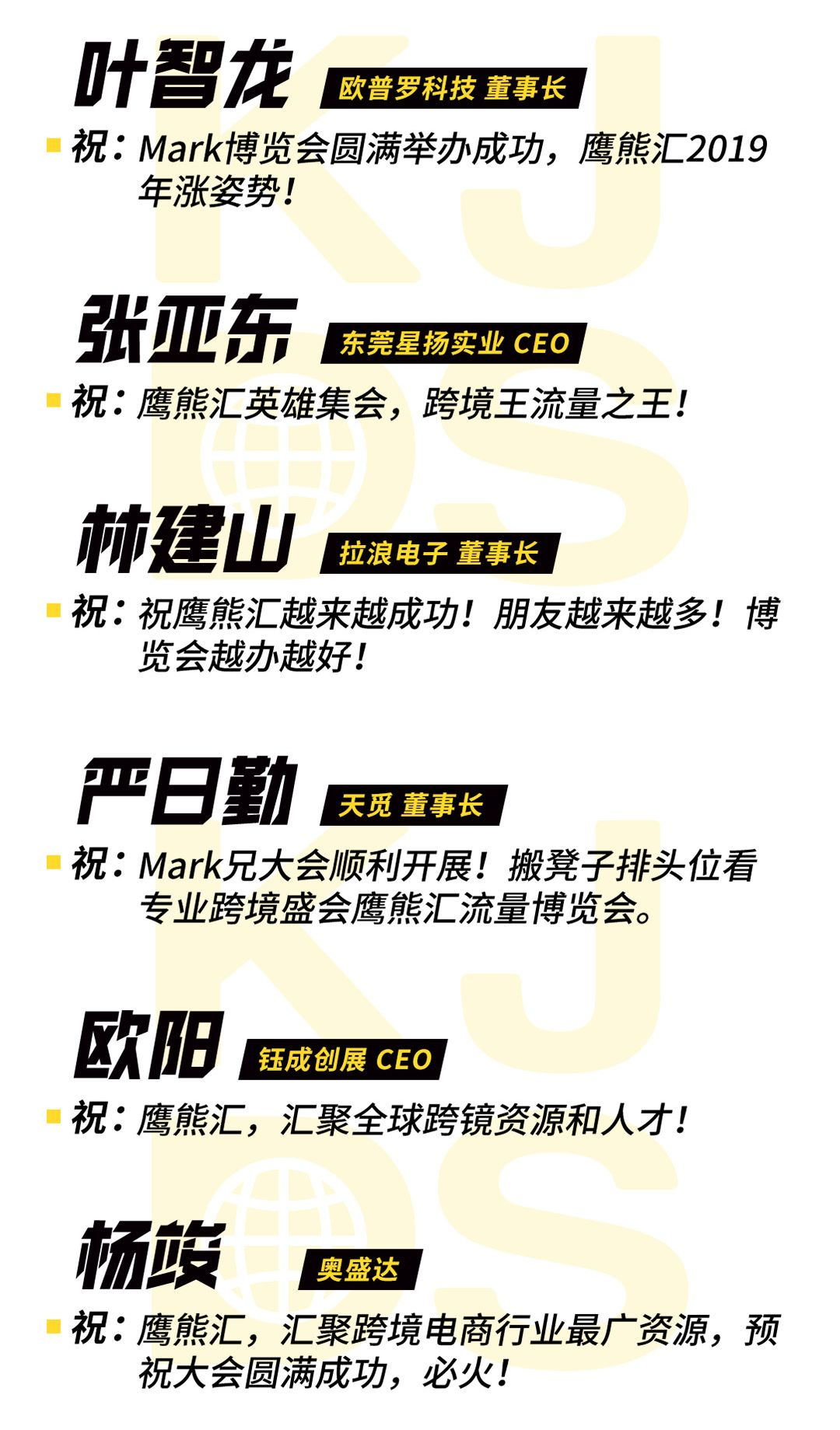 鹰熊汇将于6月29日-30日在深圳会展中心5楼举办“涨握流量”跨境电商博览会,本次博览会收到了跨境电商行业诸位行业电商公司的老板以及高管还有行业链条里的众多服务商的热烈的祝贺和诚挚的祝福!本文将列出部分行业大咖的祝福。光这份名单都已经沉甸甸了,怎么算大家整体的体量都破千亿了……