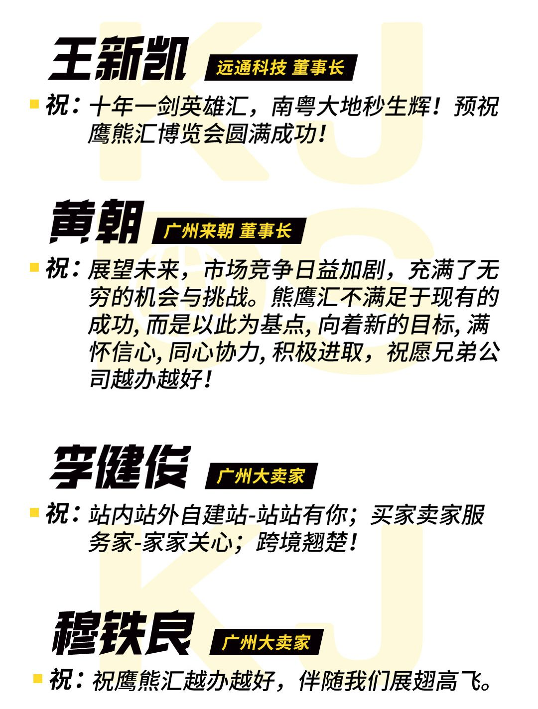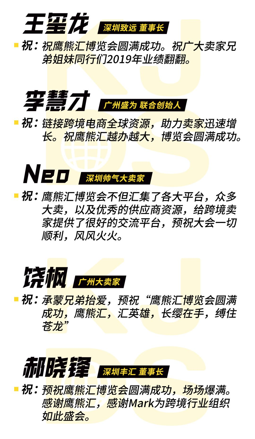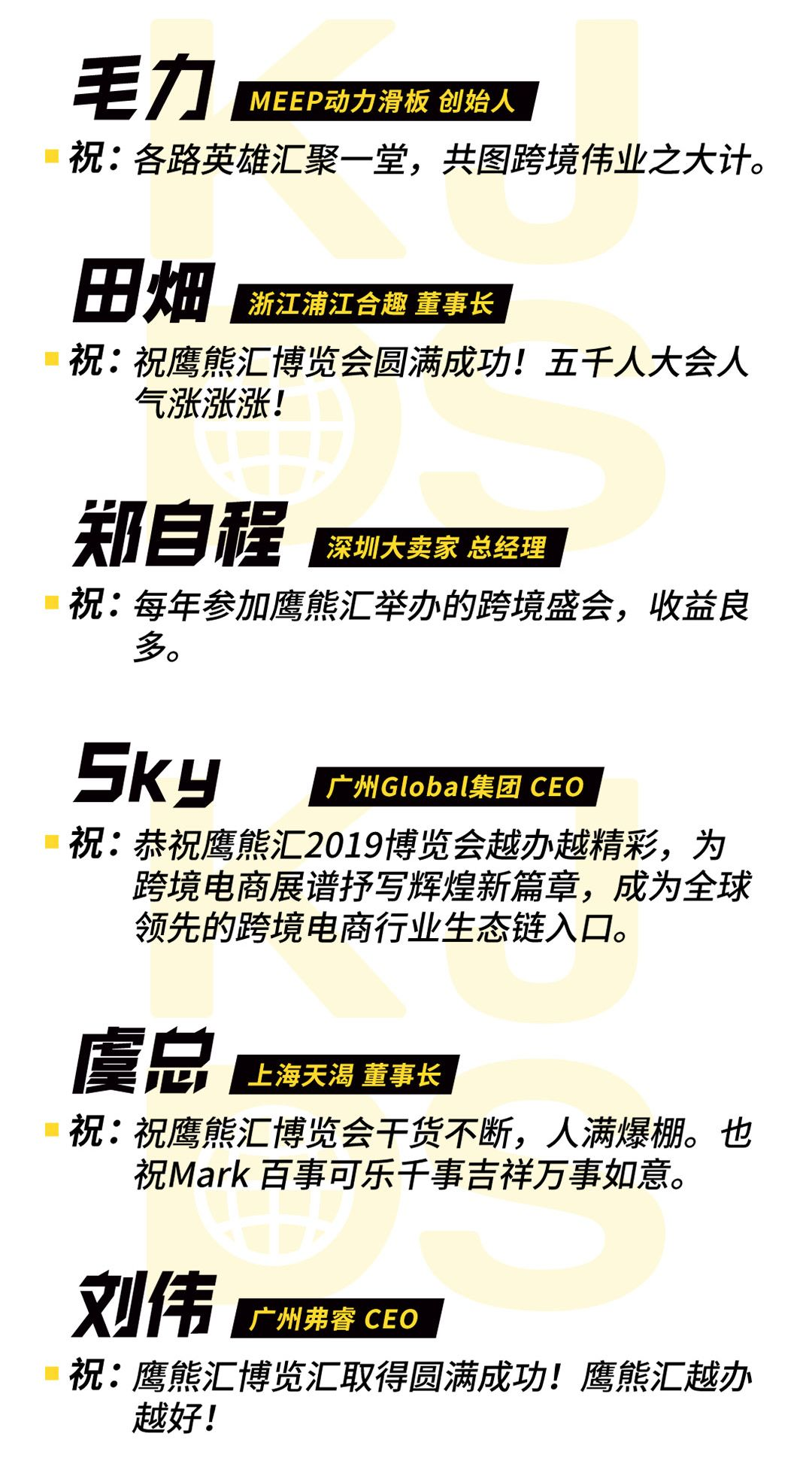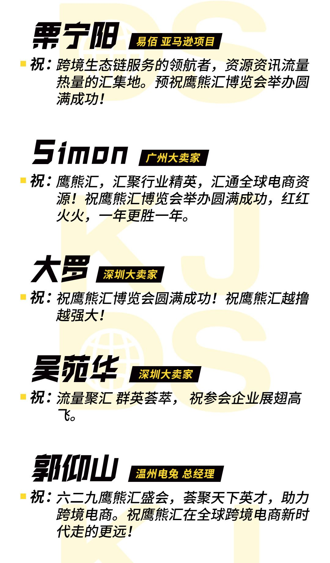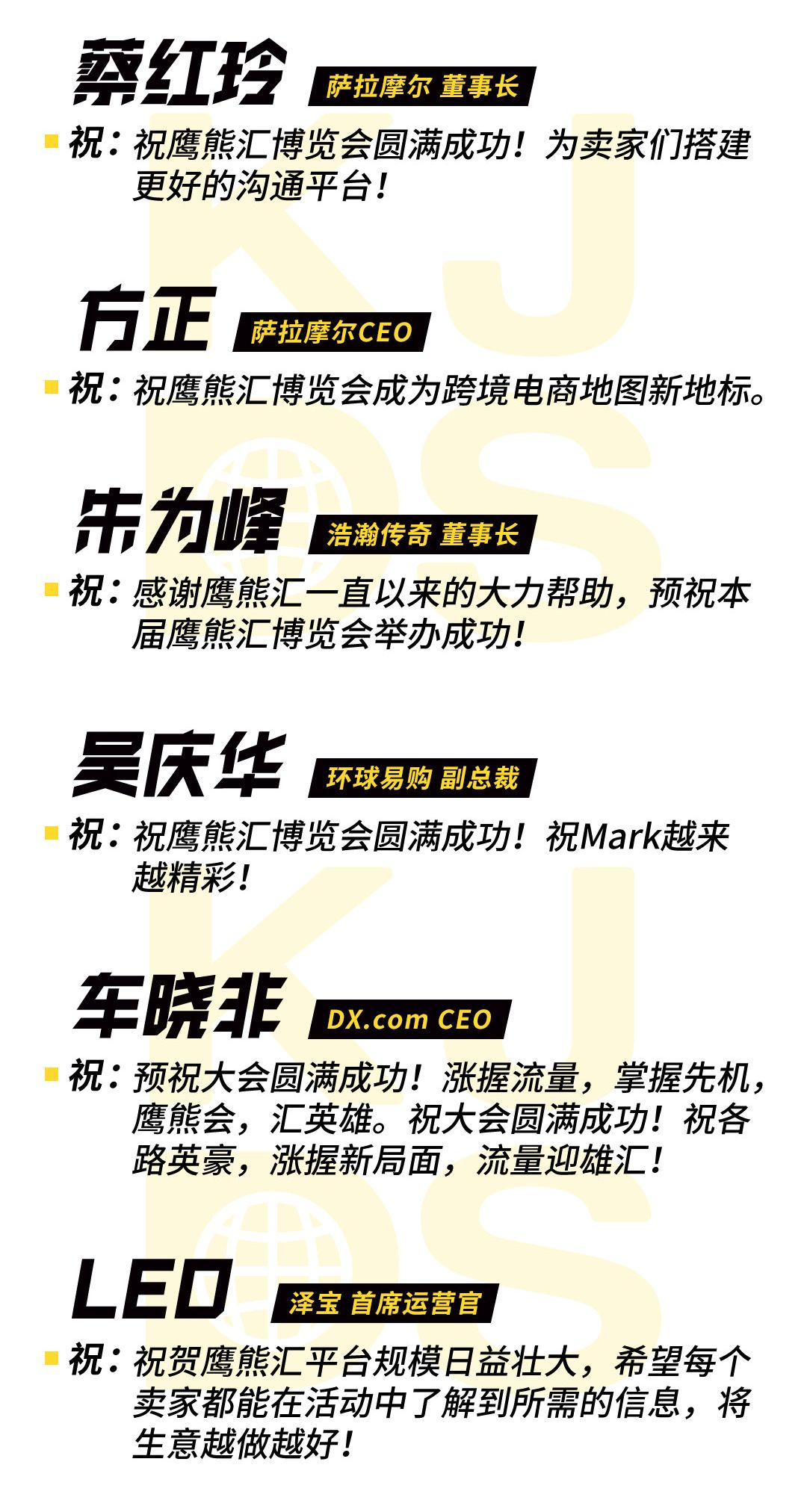 鹰熊汇将于6月29日-30日在深圳会展中心5楼举办“涨握流量”跨境电商博览会,本次博览会收到了跨境电商行业诸位行业电商公司的老板以及高管还有行业链条里的众多服务商的热烈的祝贺和诚挚的祝福!本文将列出部分行业大咖的祝福。光这份名单都已经沉甸甸了,怎么算大家整体的体量都破千亿了……