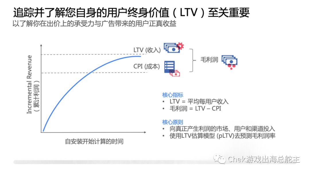 “出海第一站,首选港澳台”,“手游出海,CPI当然越低越好”…… 当年的豪言壮语还在耳边回荡,转眼已成大型真香现场? 别担心,面对浩瀚无边、瞬息万变的海外手游市场,总舵主我就是你们的定海神针,保证让大家的出海之旅一帆风顺、绝不凉凉!立马给大家送上出海深度访谈三部曲的第二部,上一期我们讲解了游戏出海的快速起步心得和进行游戏本地化的策略,这一期则会跟大家分析出海时应该如何选择市场,怎样做投放优化最有效,全是干到不行的干货,看完之后立马满状态原地复活,也不是没有可能噢! 马上点开视频,让我们红尘作伴,活得潇潇洒洒,一起扬帆出海去! 没错,还有更多的精彩要点,舵主我都已经贴心地为你罗列好啦! 超越中文地区限制,放眼全球无限商机 不少手游开发商在出海时,都会选择先到香港、台湾和马来西亚等中文地市场试水,以节省前期投入的资源,降低风险。然而事实上,这三个地区市场潜力极其有限,加起来一共只占全球游戏市场份额的4%,加上开发商扎堆试水导致竞争加剧,而部分细分市场如二次元、女性向等发展已经非常成熟,想要突围而出、获得较高回报,可谓难上加难。 因此,不少成功出海的游戏开发商都会建议大家把目光放长远些,主攻潜力更大、覆盖范围更广的语言市场,如欧美等英语区市场,获得的商机、增长及营收都会更为可观。 整个东南亚港台市场 加起来只占全球手游市场8%的份额, 冲出中文市场,势在必行 游戏出海大咖说: 游戏出海大咖说: 而希望先到港澳台和日韩地区试水的开发商,则要注意缩短战线,把宣传资源集中投入到首发、注册等关键节点,争取在游戏上线初期便令其“一炮而红”,方能获得成功。 游戏出海大咖说: 围绕主攻市场的区域文化为题材,进行游戏本地化,是我们在上期提到的要点之一。而这一期我们也想提醒大家,如果想要最大化地发挥游戏的商业潜力,在开发产品时还应具备全球性的思维。尤其是休闲游戏,可以从立足当地、放眼全球的角度出发,尽量满足全球玩家的需求,这样之后在进军其他市场时如需更换题材,也能获得事半功倍的效果。 以ROI为导向进行投放优化,获取优质玩家 买量是手游营销人员的必修课,而如今游戏想要成功出海,精细化买量则是指定动作——也就是说,获取用户的质比量更为重要,必须把广告投放的最关键指标从CPI(单次安装费用)转为ROI(广告投资回报率)。 在成熟游戏市场买量成本水涨船高的情况下,一味追求低CPI将会导致获取的用户质量日益下降,游戏变现自然更加难上加难。而改为以ROI为导向,则有助于获取对手游营收真正作出贡献的高品质玩家,为手游出海变现奠定坚实基础。 游戏出海大咖说: 游戏出海大咖说: 使用自动竞价,确保预算用得其所 Facebook的竞价系统基数大、波动性强,每个用户在不同时段的价值都不一样,如果仅使用某个固定的CPI(单次安装费用)来竞价,则难以把握市场动态,容易让价值较高的客户从指缝中溜走。我们建议采用自动竞价,让您在这场抢占高付费玩家的比赛中更具竞争力。 当然也不能出价过高,导致入不敷支,必须根据自己的承受能力和广告收益,来决定竞价预算。因此追踪并了解玩家的LTV(用户终身价值),至关重要。 附上简单的LTV计算公式, 帮助大家了解玩家带来的真正收益 了解用户终身价值,能够帮助我们更为合理地进行竞价,更重要的是能够确保预算用得其所,都投入到了真正带动营收的用户身上,从而最大化广告投资回报率。 除此之外,游戏行业大咖关于获取优质用户还有以下心得,都是极具借鉴意义的思路。 巧用类似受众定位 在进行受众定位和广告优化时,除了以留存或付费作为依据,还可以考虑从优质用户的某些特性出发,使用类似受众定位找到优质玩家。 游戏出海大咖说: 结合线下宣传渠道 不少游戏厂商在出海时往往只注重线上渠道,但事实上通过线下渠道进行宣传,能够有效提升品牌知名度、扩大品牌影响力。以苏州爱洛克ICLOCKWORK在进军台湾市场时的品牌建设为例,便举办了多场线下宣传活动,包括投放捷运广告、玩家见面会,与电玩双周刊合作推广游戏等,成功为游戏造势。 下一期我们将深入解析大家最为关心(难度也最高)的创意素材和数据分析,千万不要错过啦!