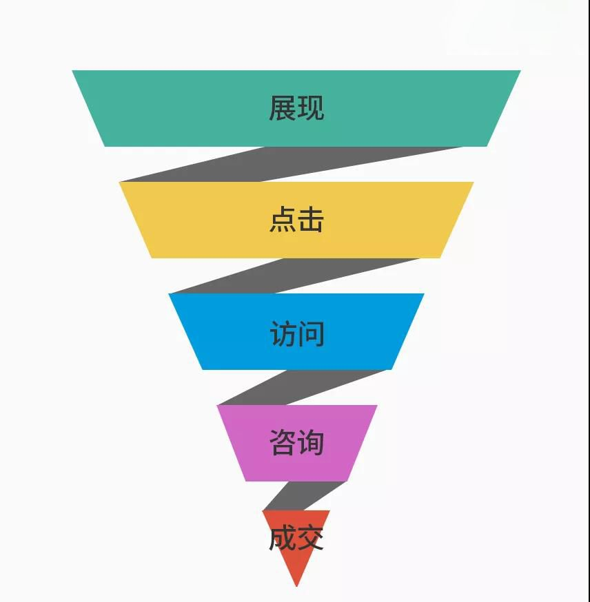 用户是要看到广告的展现,然后被广告吸引,进而形成点击,点击之后促成访问,访问后觉得有兴趣就开始咨询,咨询之后有意向便促成转化成交。