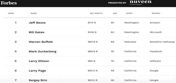 日前,福布斯官网发布了《2019年美国400富豪榜》名单,亚马逊创始人兼CEO杰夫·贝佐斯蝉联冠军(自然也是世界首富)。榜单显示,继去年之后,贝佐斯蝉联美国首富头衔,身家为1140亿美元,微软创始人比尔·盖茨和“股神”沃伦·巴菲特分别以1060亿美元、808亿美元身价位列第二、第三。