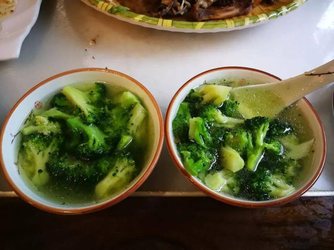 比如点了一盘西蓝花,实在是在是太咸了,最后我们把西蓝花放在碗里,然后倒上茶水,稀释来吃的,真是一言难尽啊...