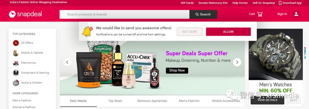 Snapdeal是一家印度电子商务公司,总部位于印度新德里。该公司由Kunal Bahl和Rohit Bansal于2010年2月创立。截至2014年,Snapdeal拥有3,00,000名卖家,超过3亿千万的产品来自超过1,25,000个区域,国家和国际品牌和零售商的800多个不同类别遍布全国6000个城镇。