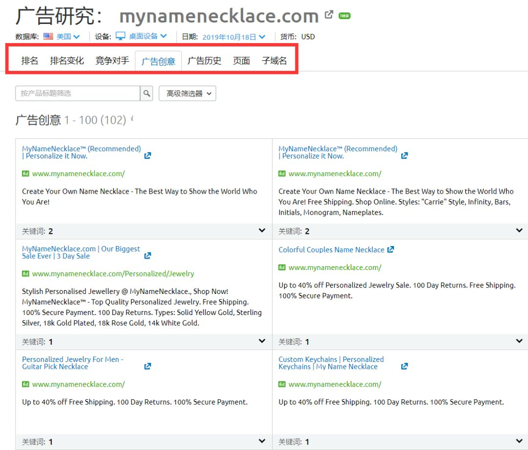 如下图,我以 mynamenecklace 这个饰品定制的网站来举例子,大家可以看到,关于竞争对手的各项指标情况。