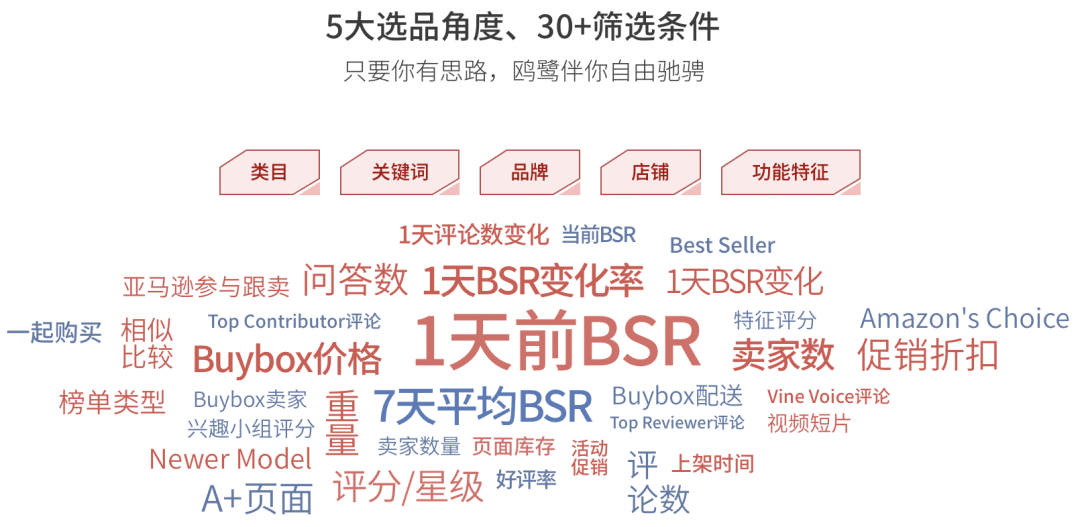 5大选品角度(品类、关键词、店铺、品牌、商品特性),30+筛选条件——他们的广告语也很不谦虚:不怕没有输出,只怕你没思路。