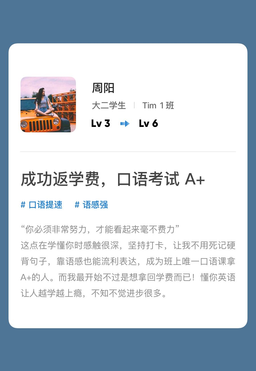 成年人的突然优秀,都是深谋远虑后的正常发挥而已。 是时候为未来发展多做些打算了,现在加入懂你英语学习,半年后你也能自信说英语,对好机会说 I can.