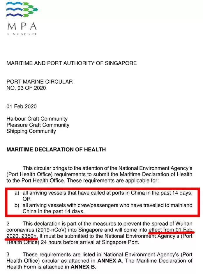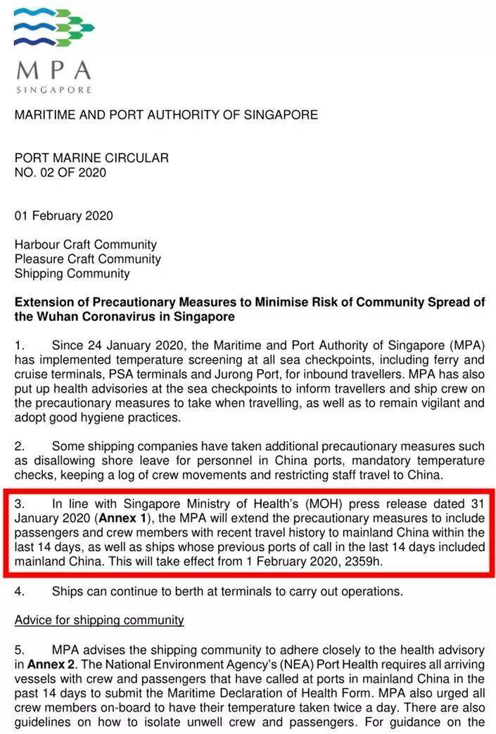 据新加坡海事和港务局(MPA)2月1日连续发布2条公告称,新加坡港禁止14天内到过中国大陆的游客入境并且对所有14天内靠过内地的船舶增加严格检疫程序。