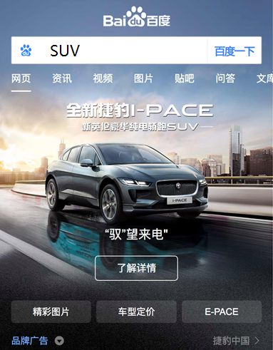 第一,这个产品是面向通用词搜索的。当用户搜索通用词之后,会显示某个品牌的“品牌专区”类似的广告。比如,搜索“SUV”,搜索结果第一位,是捷豹汽车产品的品专。
