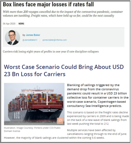 海事咨询公司Sea-Intelligence最新预测,在最坏的情况下,新冠肺炎疫情导致运输需求下降,由此引发的停航浪潮,可能给整个集运业带来230亿美元的损失。