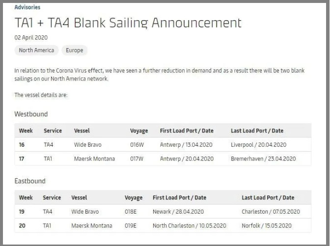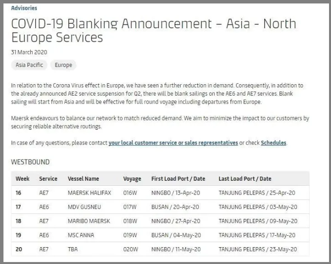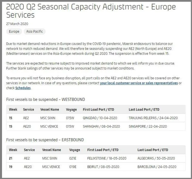 3月27日,马士基发布公告称,由于新冠肺炎疫情在全球流行,欧洲市场需求减少,为了平衡运力供应和市场需求,从2020年第15周(2020年4月6日)开始,季节性关停2M联盟运营的亚洲至北欧市场的AE2/SWAN航线和亚洲至地中海市场的AE20/DRAGON航线。