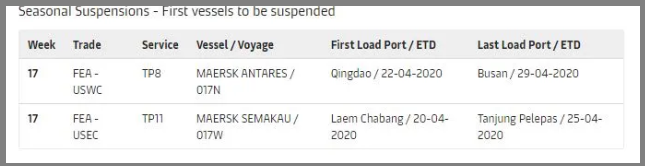 因同样原因,马士基将从第17周起,季节性关停2M联盟亚洲至北美市场的TP8/Orient航线和TP11/Elephant航线,直到第二季度结束。
