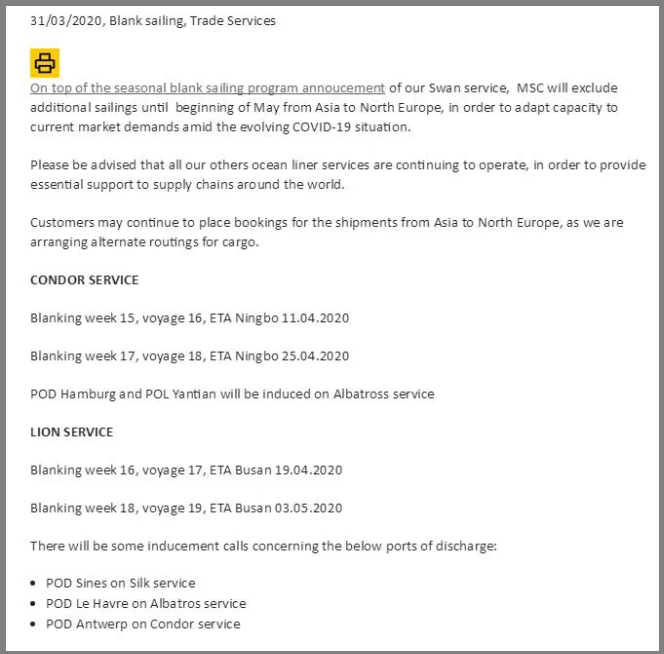 其还表示,亚欧市场撤出的运力最多,未来四周,将有29%~34%的运力从该市场撤出。撤出运力的目的,是防止运费出现“灾难性”下降,同时借此降低成本。