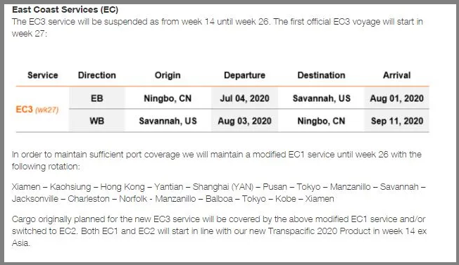 其中,EC3航线在第14周至第26周停航,运输需求将由EC2航线和调整港序之后的EC1航线满足。