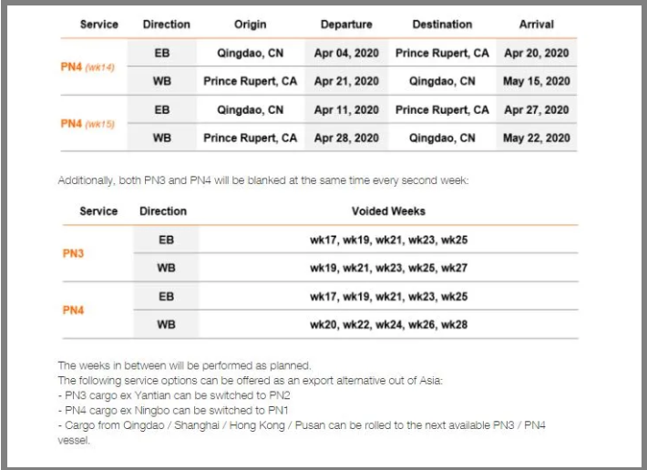 此外,PN4航线第14周和第15周西行和东行航次也均将停航,随后,PN4和PN3航线隔周运营。