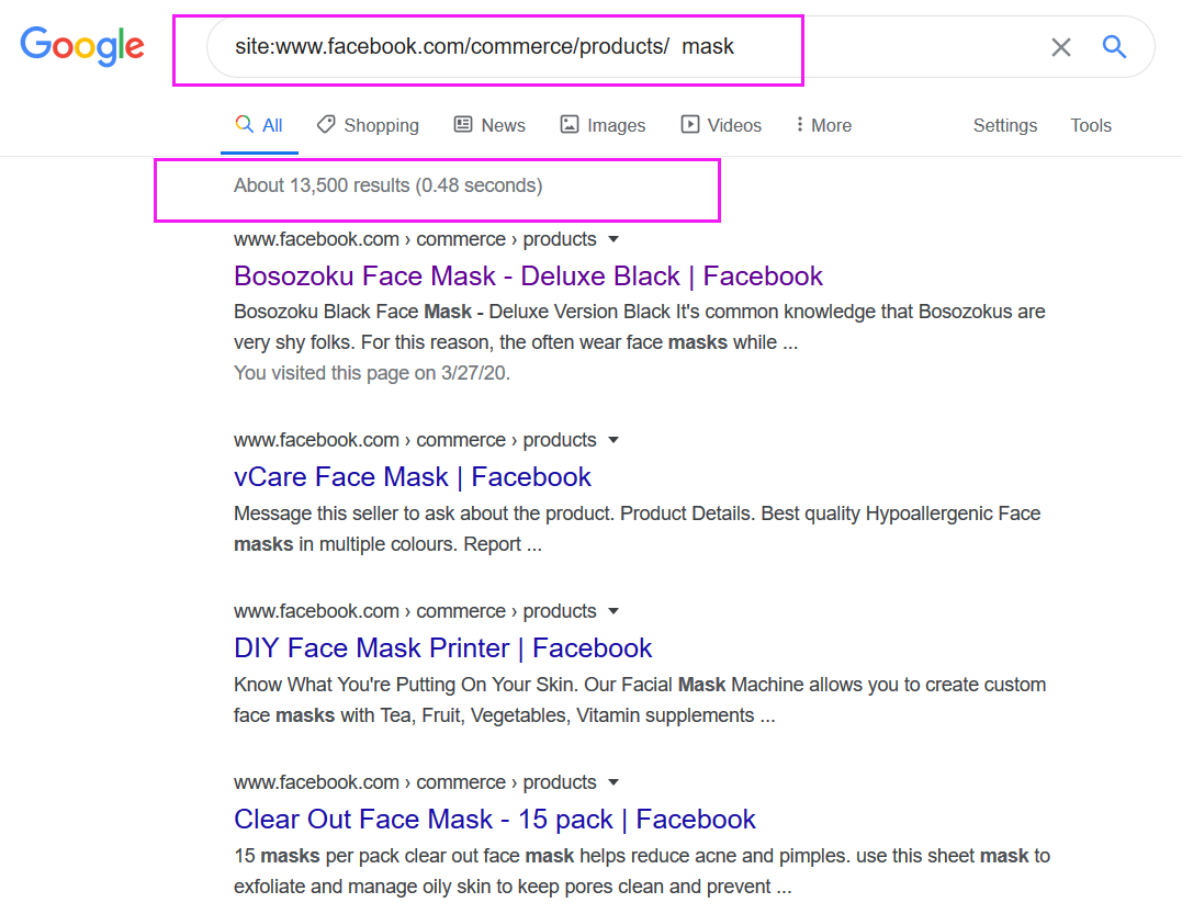 Facebook店铺搜索:site:www.facebook.com/commerce/products/ +关键词