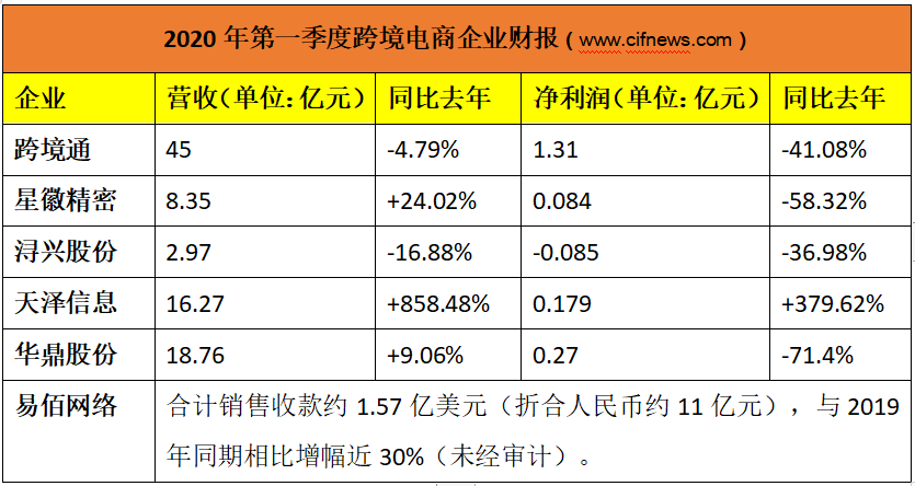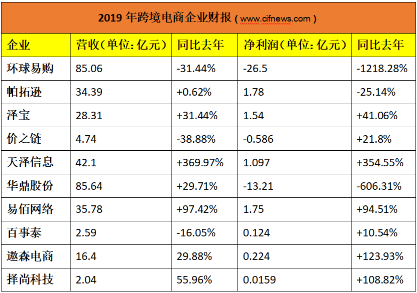 截止至5月7日,包括跨境通(环球易购、帕拓逊)、星徽精密(泽宝)、浔兴股份(价之链)、天泽信息(有棵树)、华鼎股份(通拓)以及易佰网络、百事泰、遨森电商和择尚科技均发布了2019完整财报,部分企业也同步更新了其2020第一季度的财报。