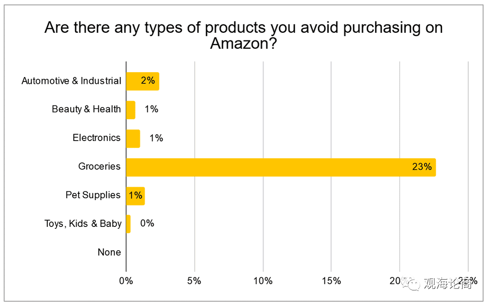 调查问及是否有购物者避免在亚马逊上购买的特定产品类型。有一个产品类别远远领先于其他任何一个类别,那就是食品杂货。近四分之一的消费者表示,他们在亚马逊上不会购买杂货类商品,而其他类型的商品几乎没有什么不愿意购买。